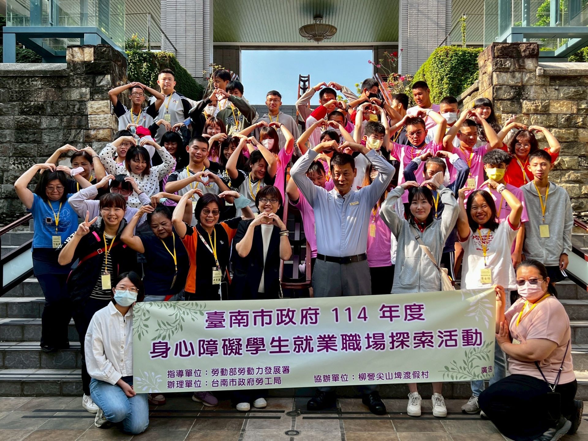 為協助身心障礙學生認識職場環境、提升就業準備度,臺南市政府勞工局今(5)日舉辦職場參訪活動,邀請29位高中職身心障礙學生及師長前往柳營尖山埤渡假村,透過實地參訪與體驗,深入了解觀光休閒產業的多元職務樣貌,協助學生銜接未來職場,打造「希望家園」。