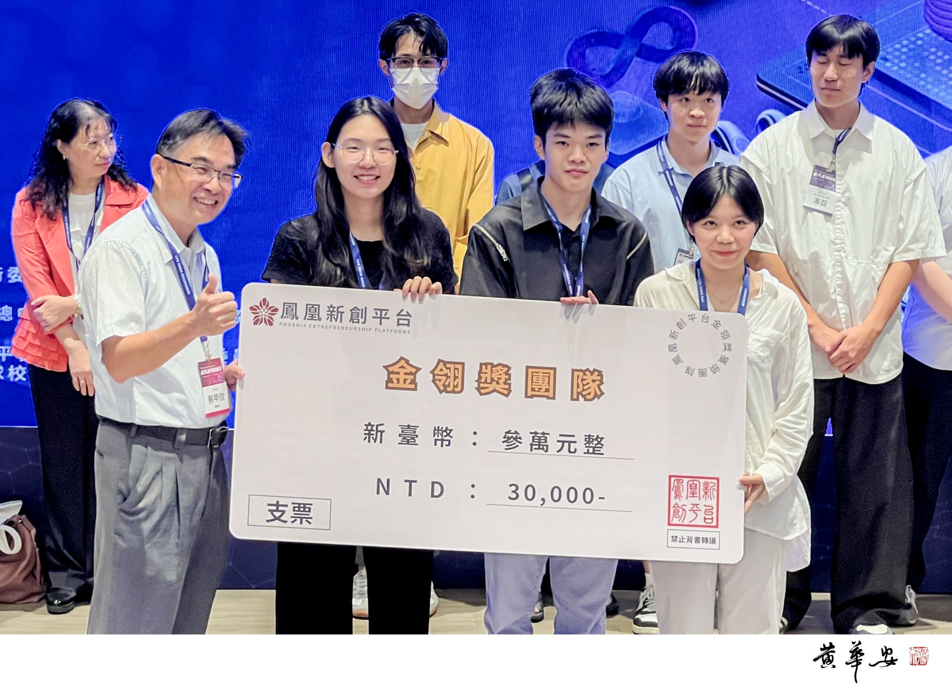 由成大與校友共同推動的鳳凰新創平台,現場精選六組金鳳凰新創團隊進行簡報,並進行頒獎。圖為獲獎的6隊之一的葳潔科技,由成大博士生邱芎蓉執行長領獎。(圖/記者黃華安攝影)