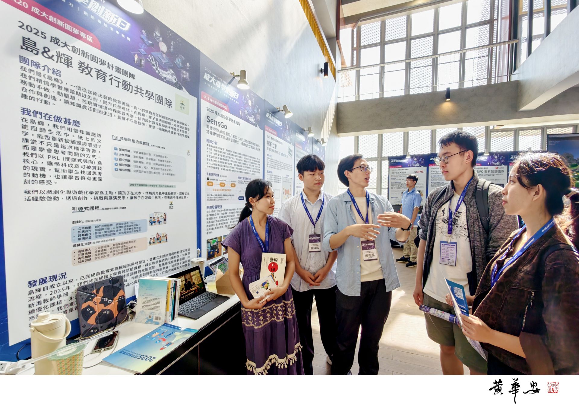 成大長期深耕創業教育,今年共有三十組「成大創新圓夢計畫」團隊於會中發表成果,圖為中文系曾柏凱(中)領軍的島&輝教育行動共學團隊分享成果。(圖/記者黃華安攝影)
