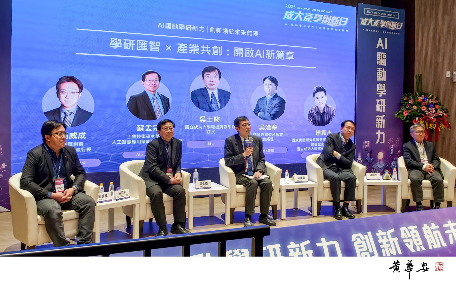 本屆論壇以「學研匯智 × 產業共創:開啟 AI 新篇章」為主軸,由成大電資學院院長吳士駿主持,邀請產官學研界重要講者工研院蘇孟宗(左二)、華碩雲端總經理吳漢章(右二)、成大電資學院副院長連震杰(右一)、智匯創育執行長周威成(右二),分享趨勢洞察與實務經驗。(圖/記者黃華安攝影)