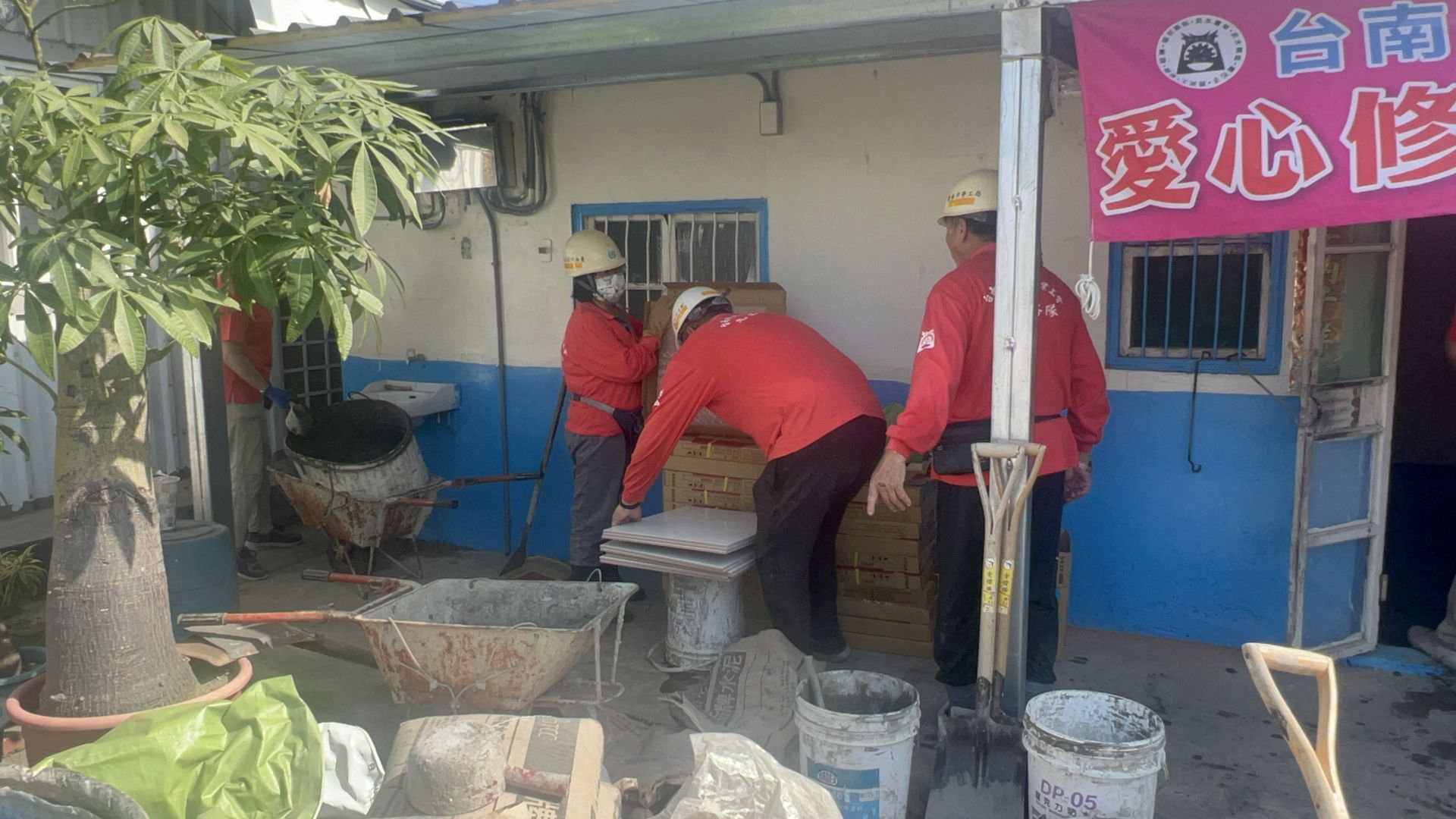 位在安南區的潘女士為弱勢原住民,長期洗腎,與同住的兒子亦因膝蓋受傷需手術休養,家中失去經濟支柱。屋舍同樣飽受風災侵襲後損毀嚴重,無力自行修補。做工行善團評估後,同樣以「工會接力」方式展開協助,自10月17日起由泥水工會先行拆除清運,再由電子加工工會修補屋頂,後續電氣工會進行電線更新與水塔安裝,今日則由泥水工會完成填縫修補作業,讓住家逐步恢復安全與安心感。