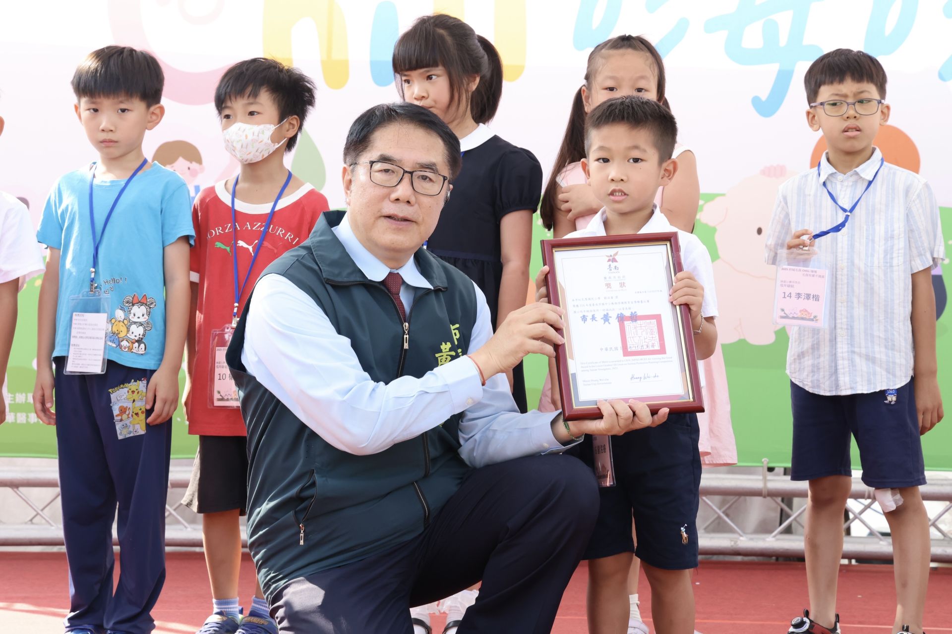 ▲黃偉哲親自頒獎給「台南市動物保護宣導繪畫比賽」56位得獎的國中小學生。(記者黃雋淮 翻攝)