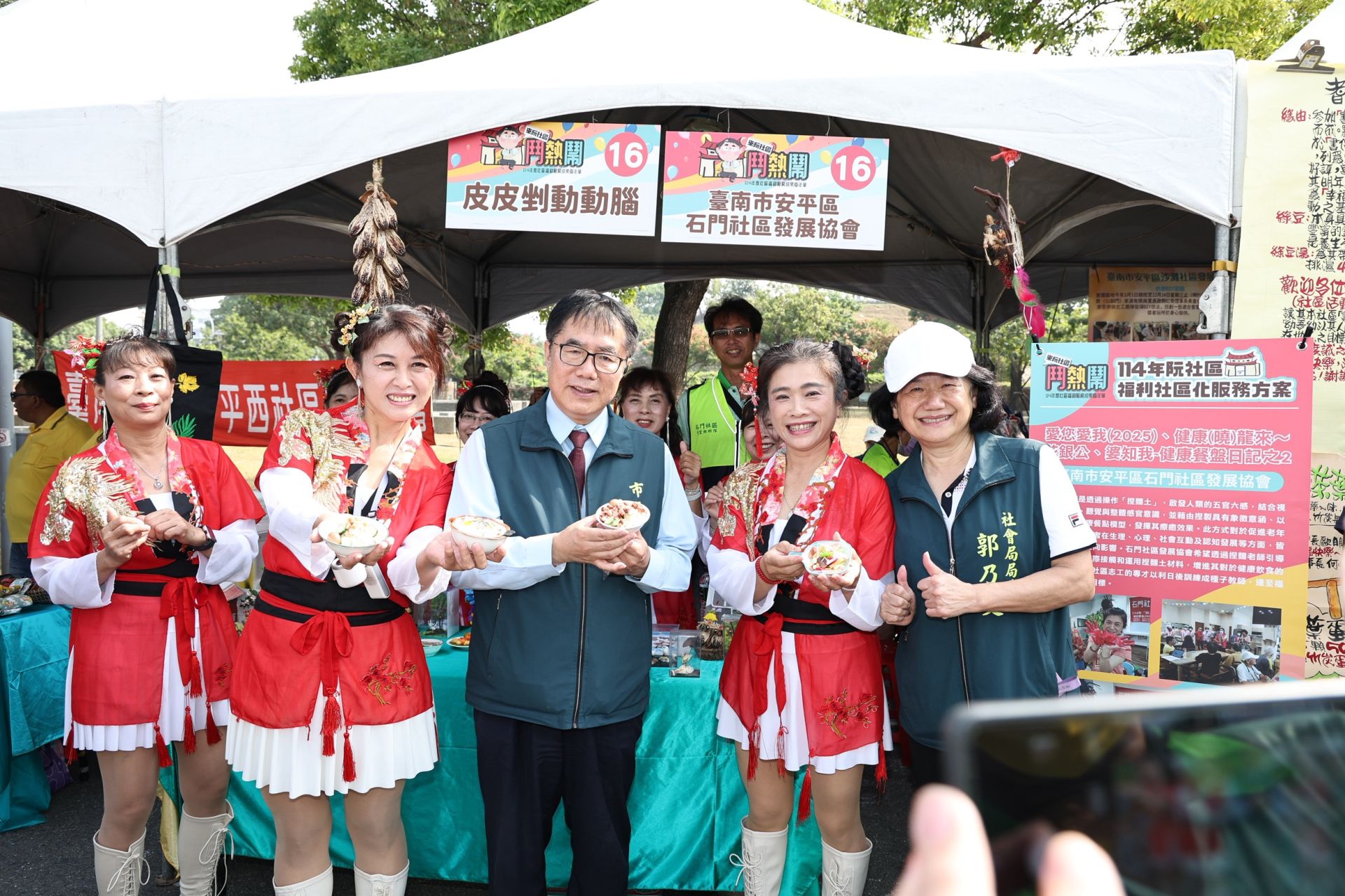 嘉年華活動中,市長黃偉哲與社區團隊一同合照,象徵攜手推動「共好社區」,展現台南溫暖、互助的城市力。
