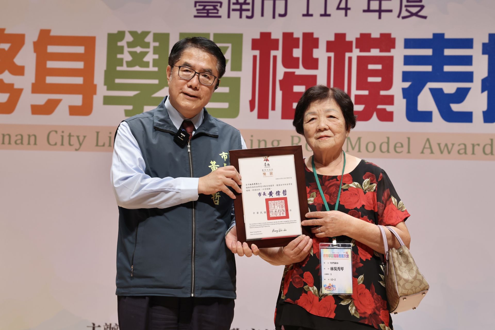 台南市教育局今(9)日在樹谷園區音樂廳舉辦「114年度終身學習楷模表揚大會」,台南市長黃偉哲親自出席頒獎,表揚全市共 185位終身學習楷模及 24所推動終身學習教育績優學校,肯定這些來自不同領域與年齡層的學習者,期望透過表揚推廣終身學習的價值,讓學習融入市民生活,打造全民共學的城市。
