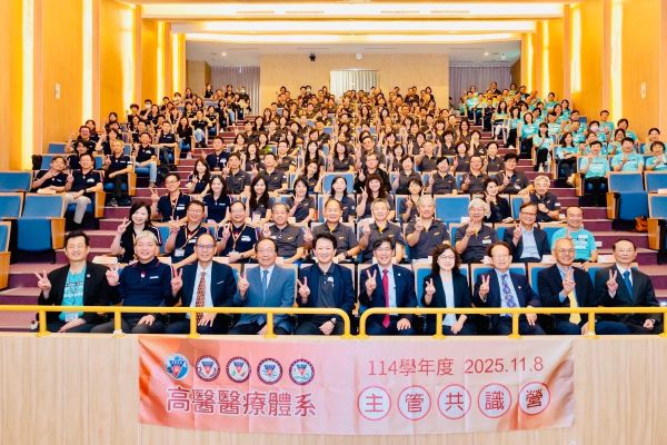 【視傳媒記者吉雄世高雄報導】114學年度高醫醫療體系主管共識營於11月8日盛大登場,現場匯聚高醫體系各院主管與醫療菁英,共同為「智慧韌性 × 健康永續」新願景凝聚共識。活動現場貴賓雲集,包括總統府「健康台灣推動委員會」副召集人、成大醫學院名譽教授陳志鴻國策顧問親臨發表專題演講,並與賴春生國策顧問、財團法人私立高雄醫學大學董事會陳建志董事長、多位董事及體系院長、副院長與數百位主管齊聚一堂,展現高醫體系團結與專業的堅實力量。