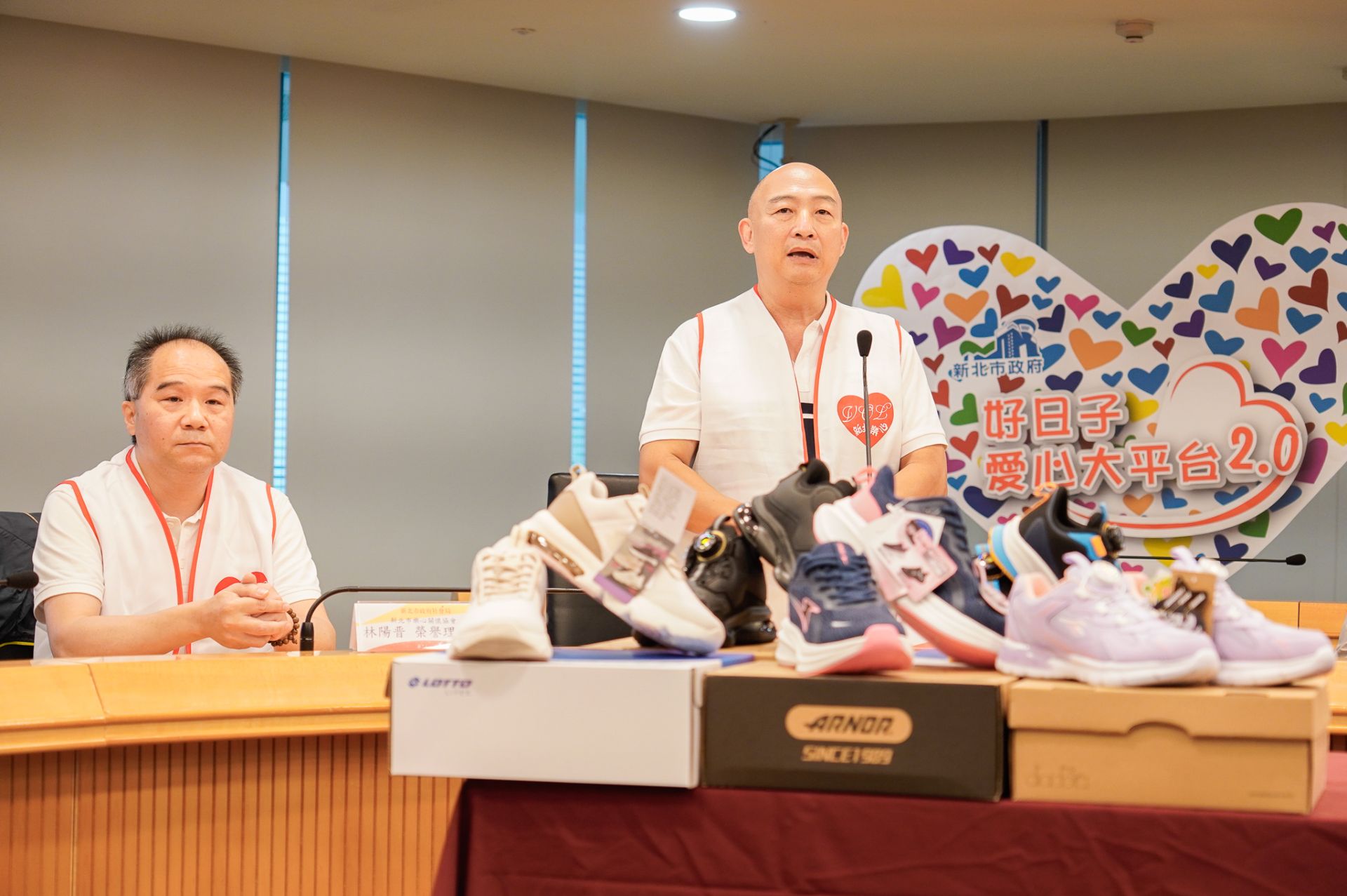 ▲新北市樂心關懷協會理事長黃世和(右)表示,捐贈鞋兌換券,希望讓弱勢家庭孩子也能享有自主選擇的權利,陪伴他們走得更有自信。(圖/新北市政府社會局提供)