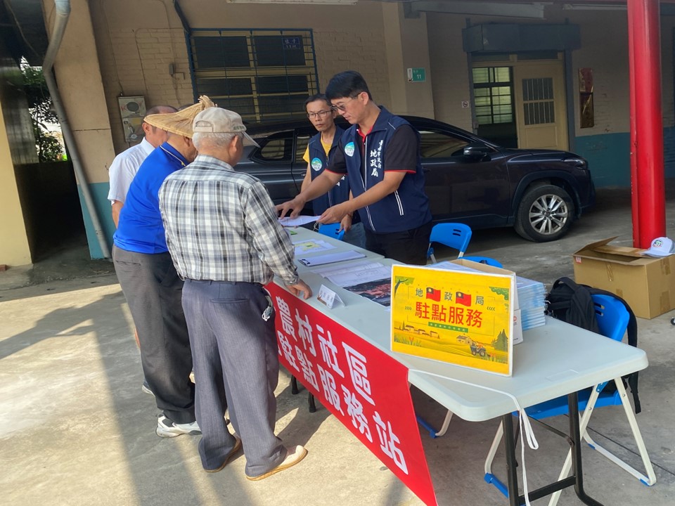 ▲官田社子農村社區土地重劃辦理意願調查 地政局每周五在鎮安宮前駐點提供諮詢服務。(地政局 提供)