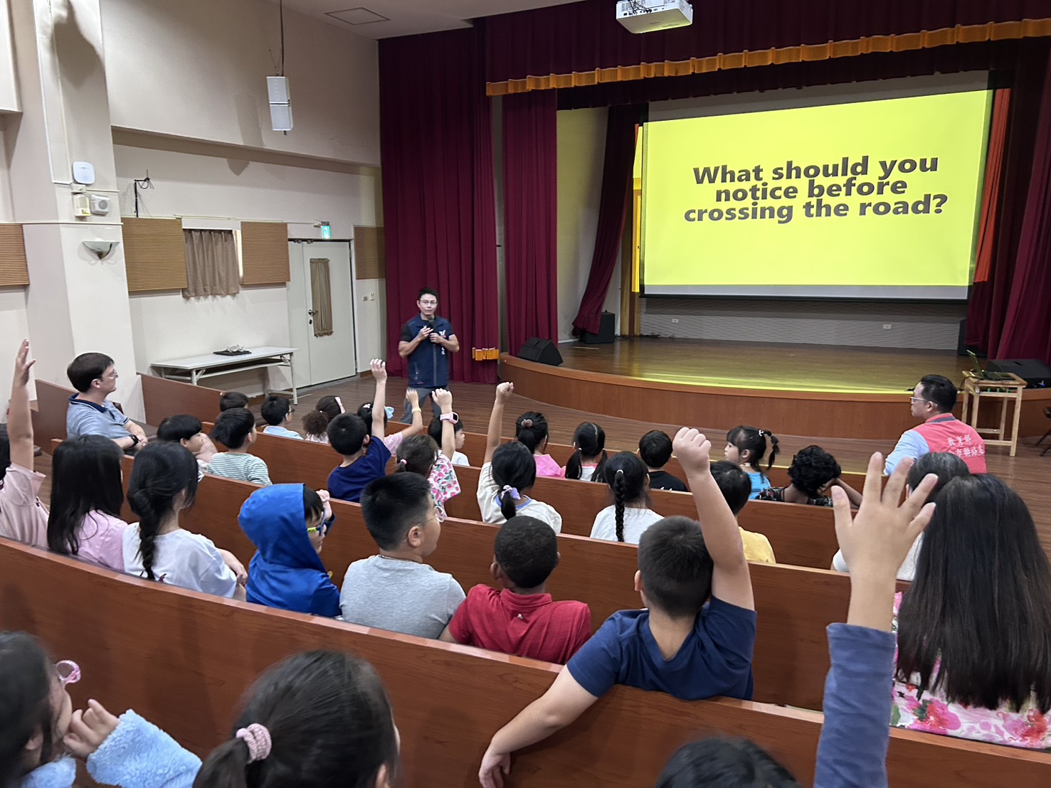 課程中,小朋友們的熱情參與為現場增添了活力。孩子們不僅踴躍舉手回答問題,還用清晰的英文回應「Look left, look right!」及「Wait for the green man!」,顯示他們已能理解並實際應用所學內容。現場也安排情境模擬活動,讓孩子扮演行人、駕駛與指揮角色,在遊戲中實際練習如何判斷通行時機,加深其印象。交通大隊表示,學童是交通環境中最需要保護的族群,但同時也最能透過教育快速建立良好習慣,家長與師長若能在日常生活中示範遵規行為,將能形成最佳的安全學習環境。