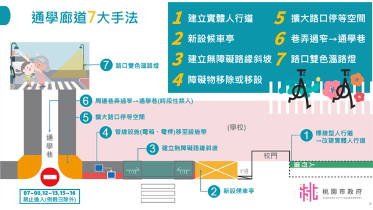 桃園市政府採「通學七大手法」持續推動全市通學廊道建設,截至目前全市共完成138所學校的通學廊道規劃,其中87所已完工、6所施工中、45所規劃中。工務局強調,市府將持續推動相關建設,秉持「以人為本」的交通理念,讓改善不只是更順暢,更安全。未來也會持續投入資源,完善道路系統與通學設施,打造安全、舒適的上學環境,讓學童安心上學、家長放心接送。( 圖/工務局提供)