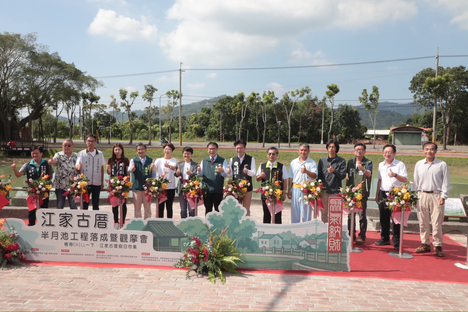 整治後的半月池重現鹿陶洋景致,市府今(15)日舉辦「江家古厝半月池工程落成暨觀摩會」及「楠得CHILL一下‧江家古厝秋日市集」,邀請民眾走讀聚落故事,並順道選購在地商品,市長黃偉哲也親自到場為活動揭幕。
