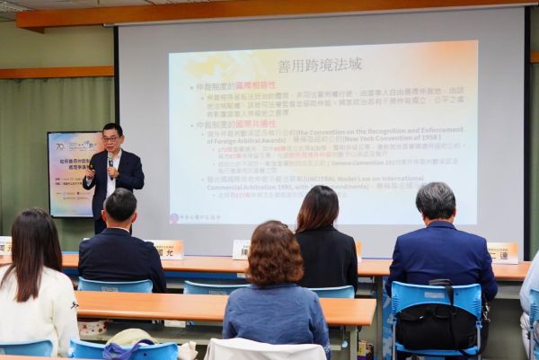 謝國允律師以「仲裁在紛爭解決的定位與策略應用」為題,強調仲裁制度兼顧效率、專業與信任,是企業國際化的必備基礎與私法自治、契約自由的最後一哩路,呼籲善用仲裁創造多方共贏。
