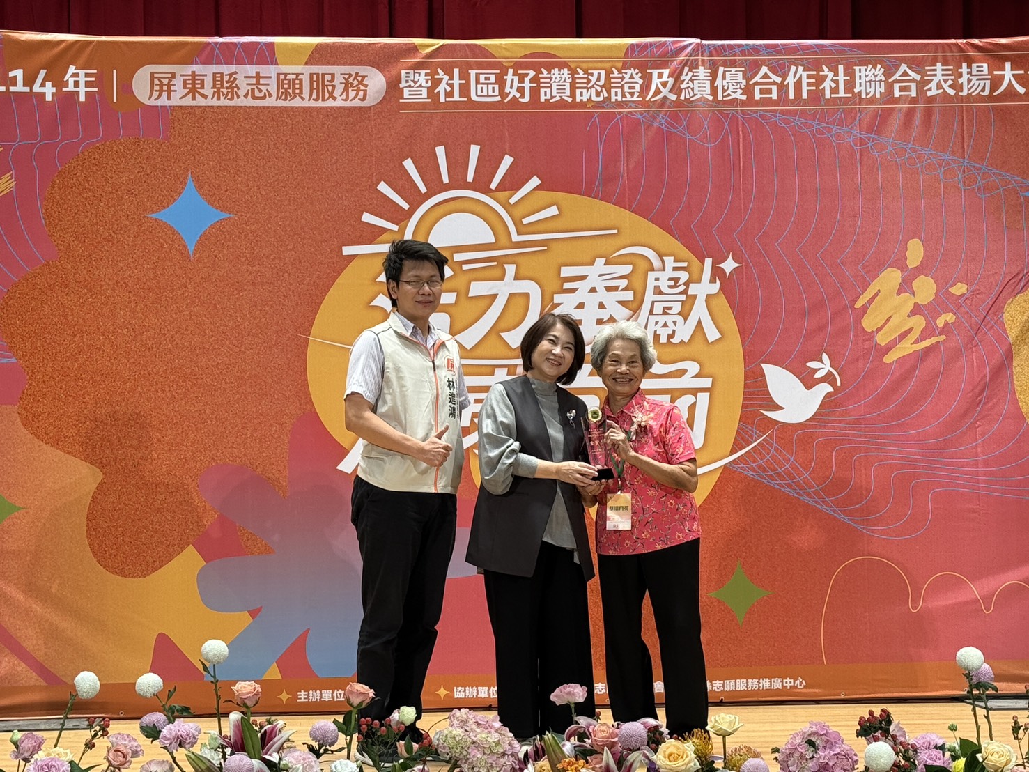 ▲114年屏東績優志工暨好讚社區、合作社聯合表揚_81歲的蔡潘月英女士是今年金質獎最高齡。(圖/屏東縣社會處)