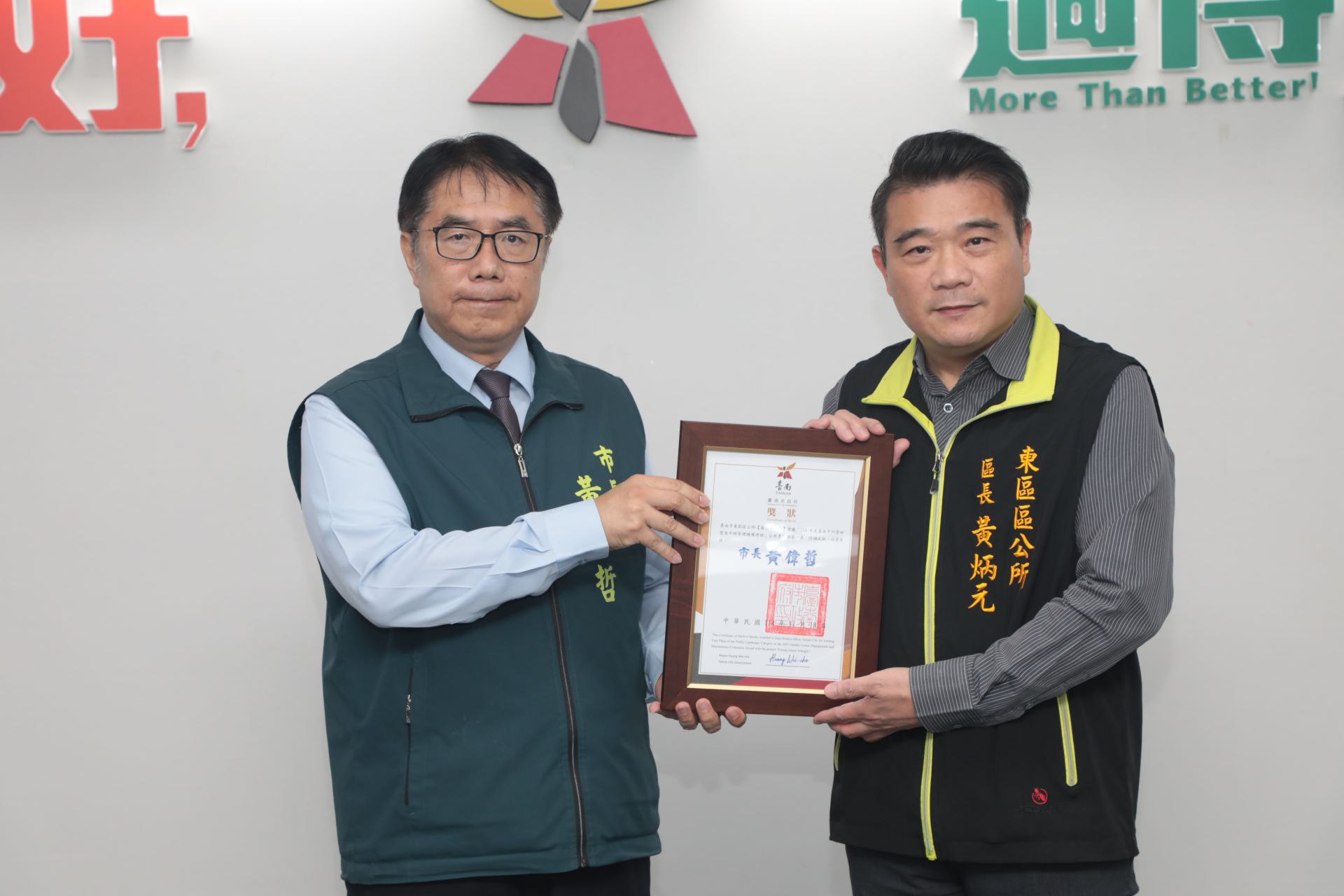 ▲東區區長黃炳元接受市長黃偉哲頒獎。(記者黃雋淮 翻攝)