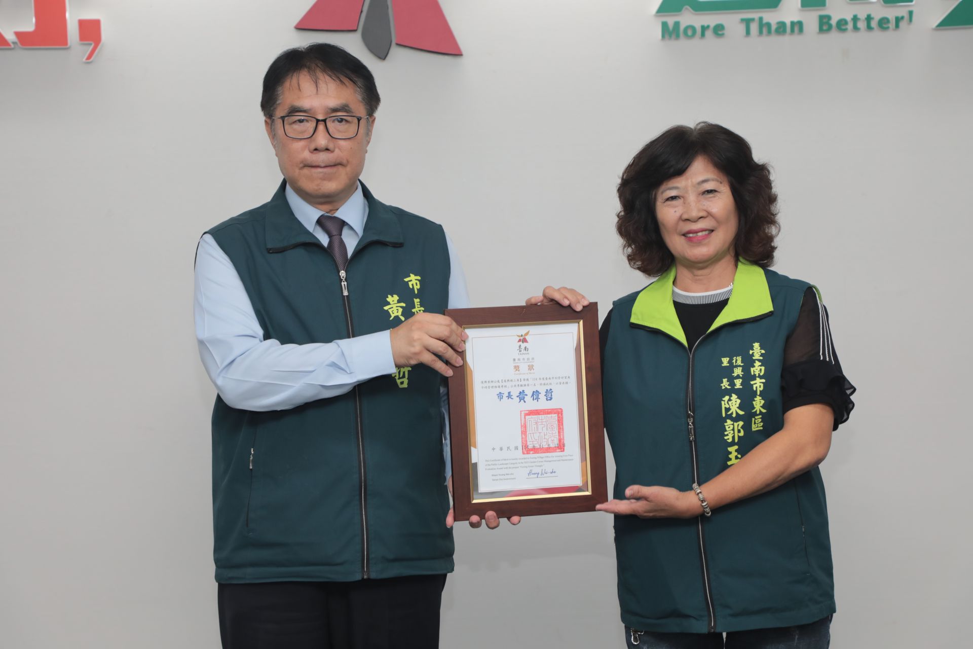 ▲復興里辦公處里長陳郭玉指接受市長黃偉哲表揚。(記者黃雋淮 翻攝)