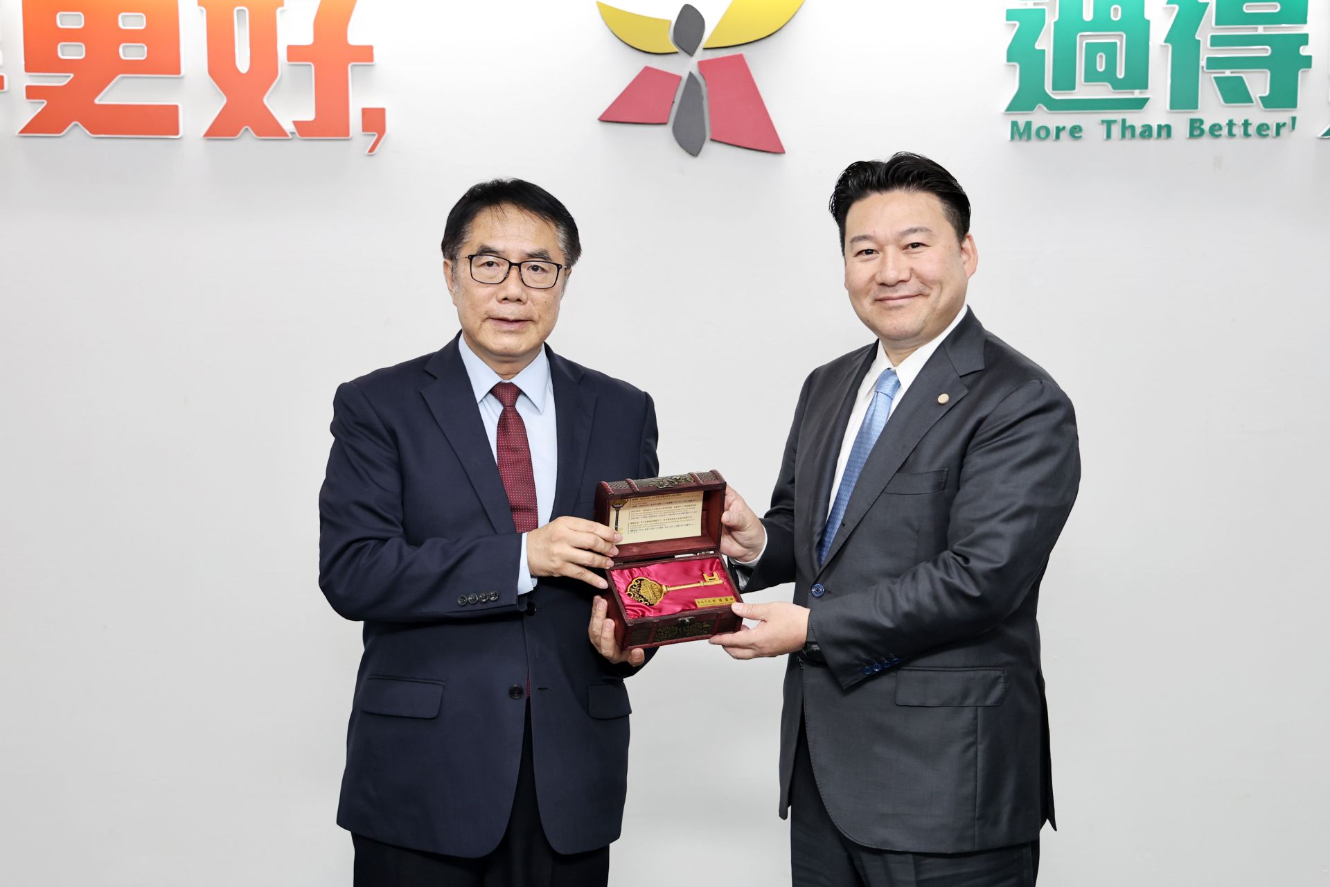 ▲市長黃偉哲致贈臺南市鑰給別府市長野恭紘市長。(新聞處 提供)