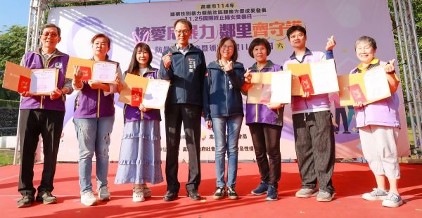 【視傳媒記者吉雄世高雄報導】為響應「國際終止婦女受暴日」,社會局家防中心於11月22日下午在衛武營都會公園夏日大道舉辦「114年度國際終止婦女受暴日宣導暨建構性別暴力領航社區服務方案成果發表活動」,以「擁愛反暴力,鄰里齊守護」為主題,串連跨局處網絡與社區力量,共同推動暴力防治與初級預防工作。活動以象徵性別平等與力量提升的紫絲帶意涵,由市府王宏榮副秘書長、社會局蔡宛芬局長、貴賓及社區夥伴共同傳遞紫絲帶,象徵凝聚公私協力的守護能量,一同承諾「拒絕暴力、從社區開始」啟動,共織屬於高雄的紫絲帶,並吸引超過800名親子與市民熱情參與,在輕鬆有趣的氛圍中認識家暴防治、兒少保護等重要觀念。