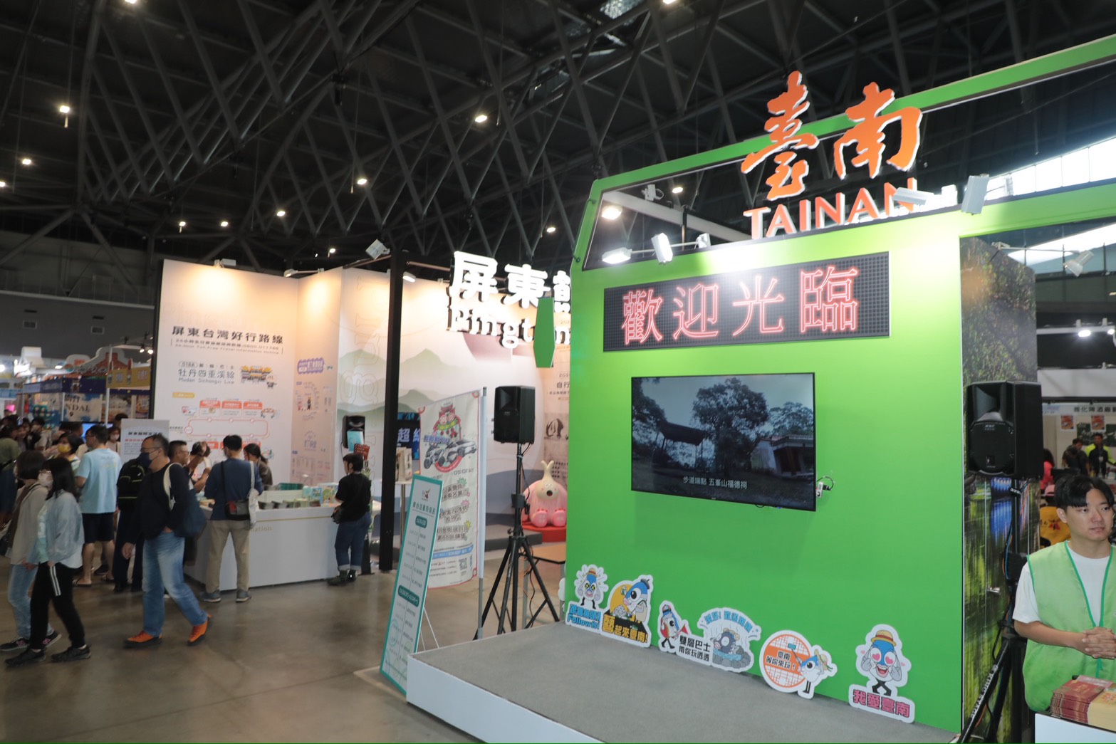 ▲台南展區以明亮綠色視覺迎接參觀者,展出觀光亮點與特色旅遊路線,吸引不少民眾駐足拍照與詢問。(新聞處 提供)