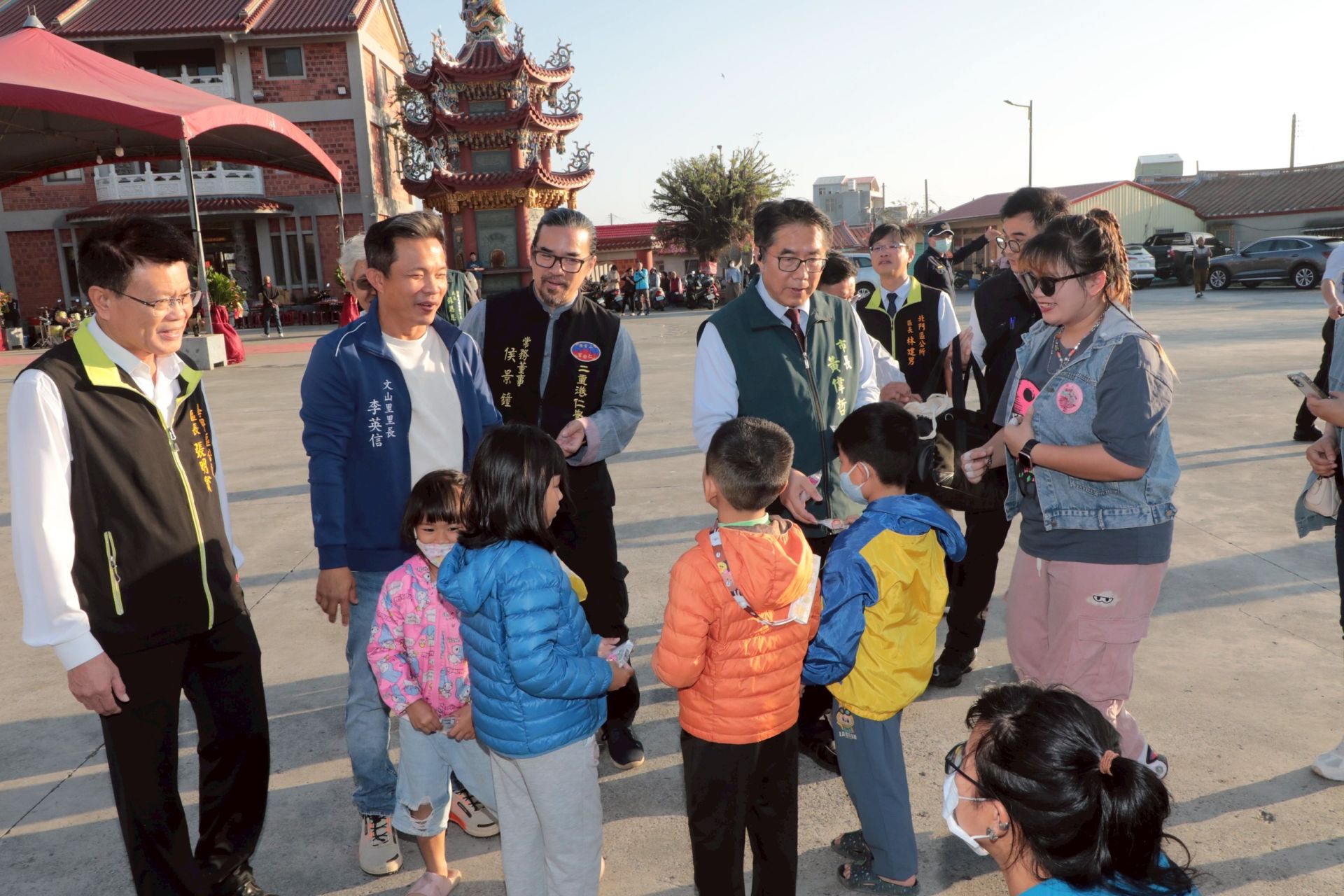 ▲黃偉哲與地方鄉親及孩童親切互動,現場氣氛溫馨,象徵信仰傳承與社區凝聚力。(記者黃雋淮 翻攝)