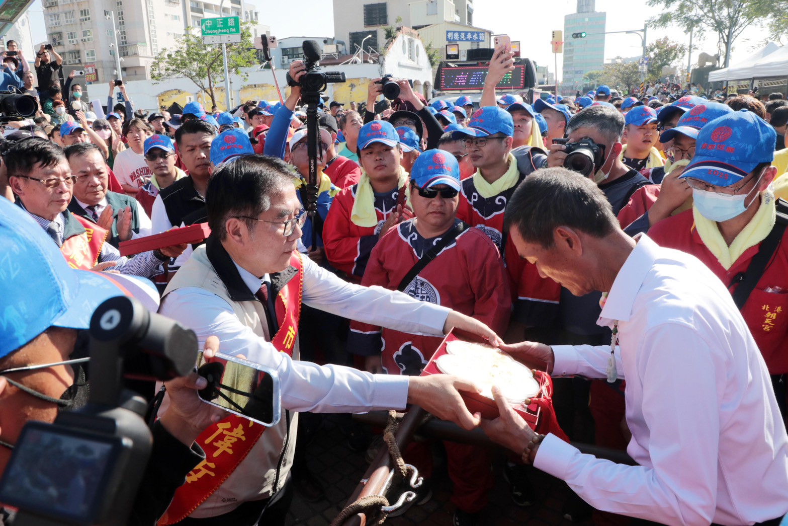 ▲臺南市長黃偉哲率市府團隊於河樂廣場接駕。(民政局 提供)