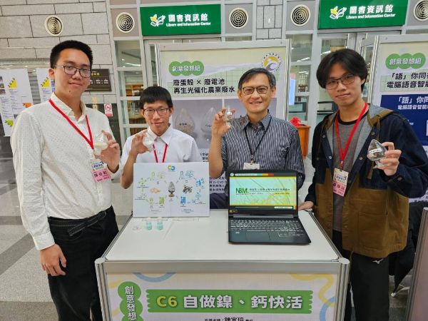 「創意發想組」首獎則由「自做鎳、鈣快活」獲得,作品《廢蛋殼×廢電池再生光催化農業廢水》由化學工程及材料工程學系(化材系)特聘教授鍾宜璋指導,團隊成員包括陳伯勳、吳御郎與廖振廷。作品將廢蛋殼中的碳酸鈣與回收廢電池金屬重新製成光催化複合材料,用於農業廢水污染物之降解處理,將日常廢棄物轉化為具功能性的環工材料。