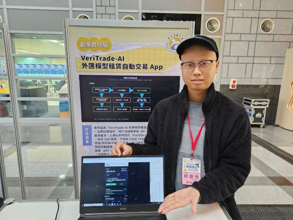 「創業實作組」首獎由「高大量化隊」奪得,作品《VeriTrade-AI 外匯模型租賃自動交易 App》由資訊工程學系(資工系)系主任黃健峯指導,團隊成員郭俊逸、黃政諭共同研發。作品聚焦外匯市場資訊龐雜、波動高與散戶門檻大的痛點,以 AI 模型結合自動化交易,打造具透明度與審計能力的量化交易工具。
