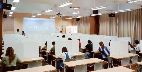 圖1:高雄大學語文中心主任陳志文(左2)、泰語顧問泰語顧問潘婉玲助理教授(Asst. Prof. Warinthorn Paphakin),以及朱拉隆功大學考官,共同進行試卷啟封與場務作業。