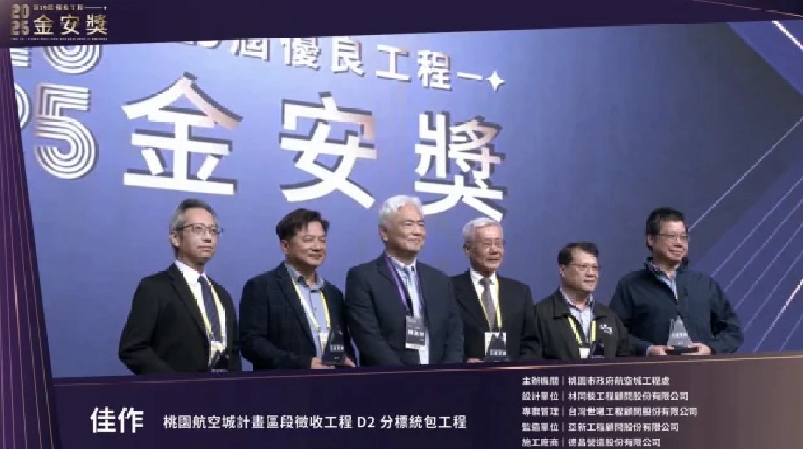航空城工程處則以「桃園航空城計畫區段徵收工程D2分標統包工程」首次參賽,首戰即拿下佳作。該工程總開發面積 209.12 公頃,工程金額達92.5億元,面對介面複雜、施工項目繁多,且涵蓋整地、道路橋梁及管線鋪設等重要基礎設施的大型區段開發工程,團隊精進傳統「營建四化」,導入「安全可視化」及「風險可視化」,達成「營建六化」理念,由數位化監測與視覺化警示系統,讓安全管理更即時、透明且具預警功能。依循 PDCA(Plan–Do–Check–Act)管理循環,強化制度化管理與持續改善機制,讓安全管理更即時、透明、可控。