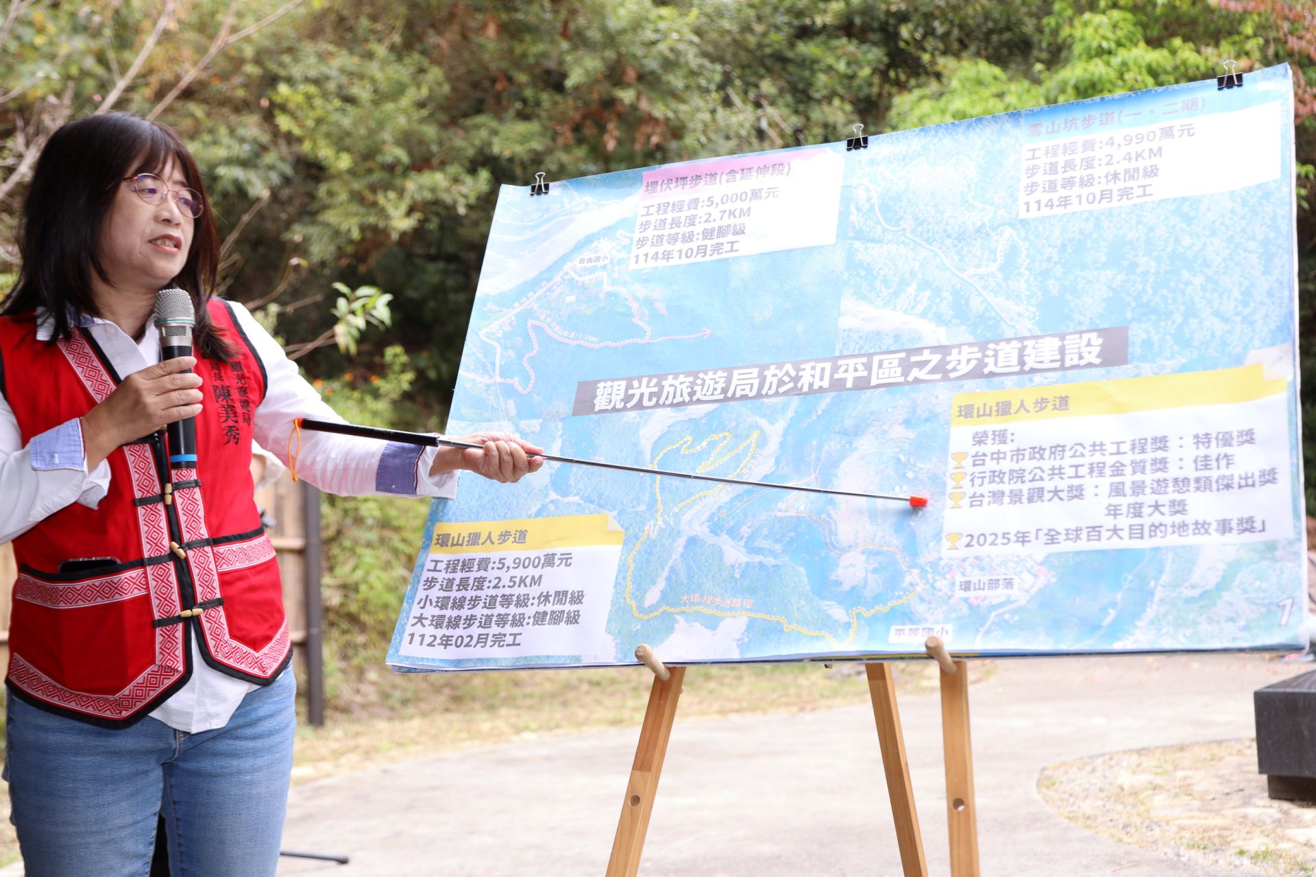 除了硬體建設,市府也致力於和平區的觀光行銷與文化推廣。盧秀燕提到,今日便有來自新北市的遊客專程造訪雪山坑步道,並可結合新社區花毯節等周邊活動,形成區域旅遊效益。她強調,目標是讓和平區逐步實現經濟自給自足,打造永續的觀光產業鏈。