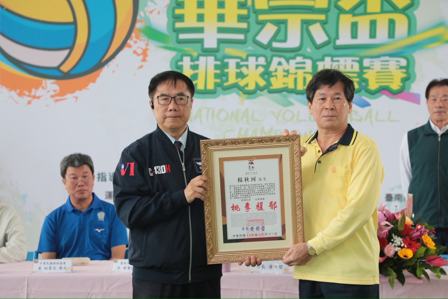 ▲市長黃偉哲頒發「榮譽市民」予長期投入排球基層的教練楊秋河,肯定其多年深耕運動教育、培育無數優秀選手的卓越貢獻。(記者黃雋淮 翻攝)