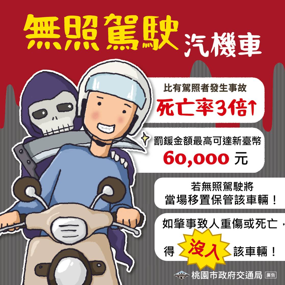 圖說:無照駕駛三讀通過加重罰鍰 ,桃市府提醒考照再上路,以免荷包大失血。( 圖/交通局提供)
