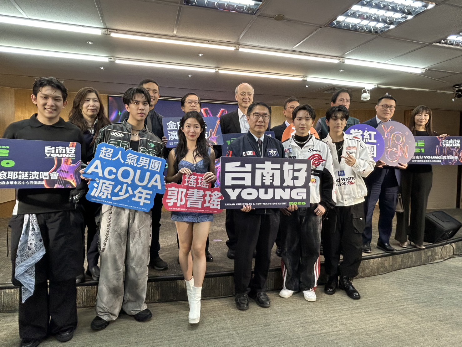 「2026台南好young」耶誕跨年系列活動首波卡司公布記者會今(2)日於永華市政中心舉辦,市長黃偉哲親自揭曉演出名單,集結台灣、日本、韓國多組超人氣藝人與樂團,從12月20日搖滾耶誕、12月27日新營草地音樂會,到12月31日跨年晚會,打造橫跨世代、風格多元的「天花板等級」陣容,邀請全國民眾相約台南迎接2026。