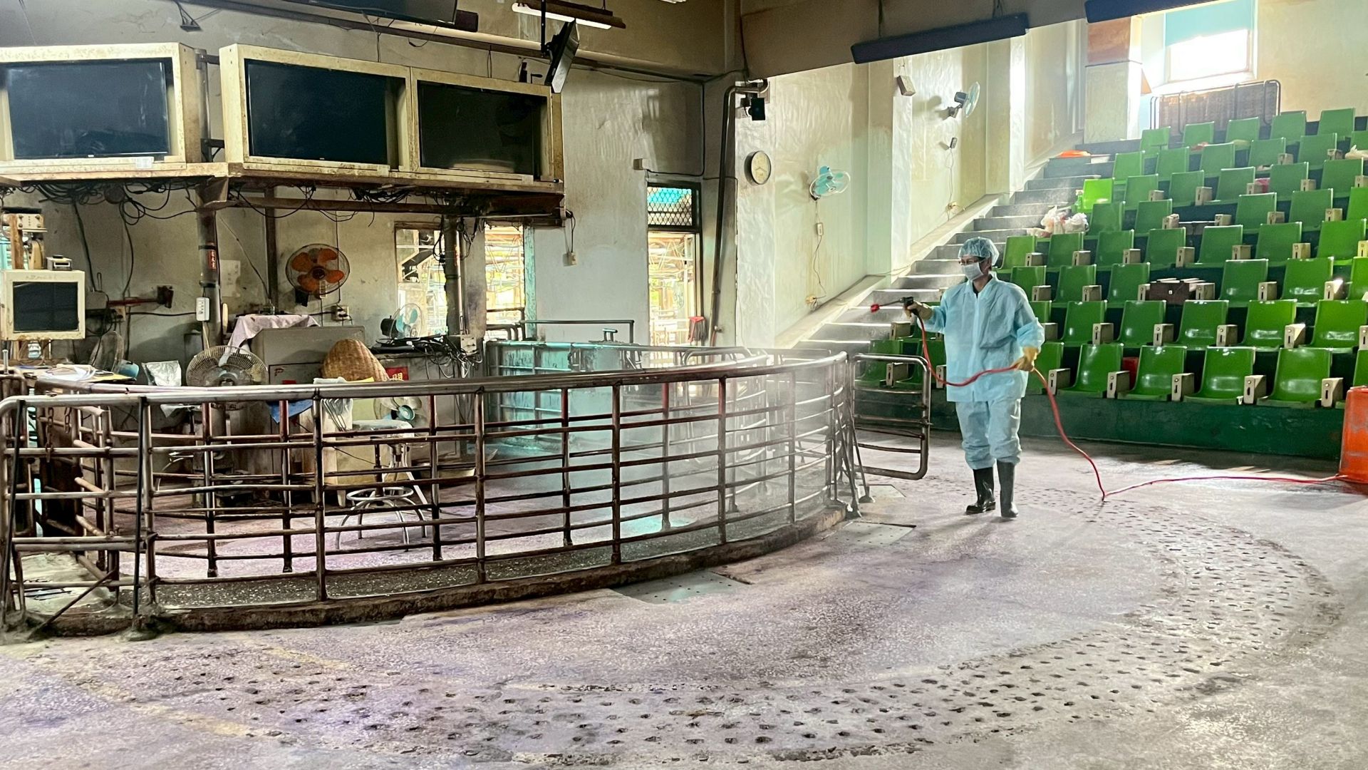 ▲11月7日午夜12點解禁後,已可開始屠宰豬隻,臺南市肉品市場於拍賣前、後均加強清消。(農業局 提供)