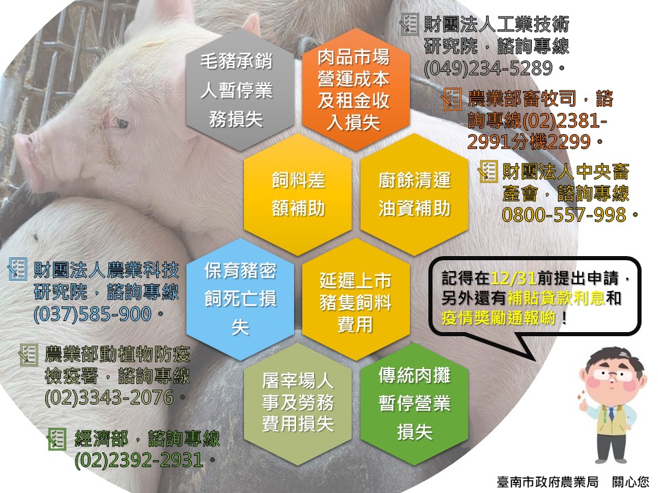 臺南市政府農業局提醒,有關產業支持協助方案將分別由財團法人中央畜產會受理取得再利用檢核養豬場之「飼料差額補助」、「廚餘清運油資補助」,以及所有養豬場皆可申請之「養豬農民之延遲上市豬隻飼料費用」;由財團法人農業科技研究院受理「異地批次母豬場之保育豬管制移動密飼死亡損失」;由農業部畜牧司受理「肉品市場營運成本及租金收入損失」;由財團法人工業技術研究院受理「毛豬承銷人之暫停業務收入損失」;由農業部動植物防疫檢疫署受理「屠宰場停宰期間之人事及勞務費用損失」;由經濟部受理「禁運禁宰期間傳統肉攤暫停營業之收入損失」;另還有「養豬農戶之疫情通報獎勵」及「養豬場、屠宰場、農民組織及農企業之金融支持」,請於12月31日前配合補助規定備妥文件,逕向受理單位提出申請。