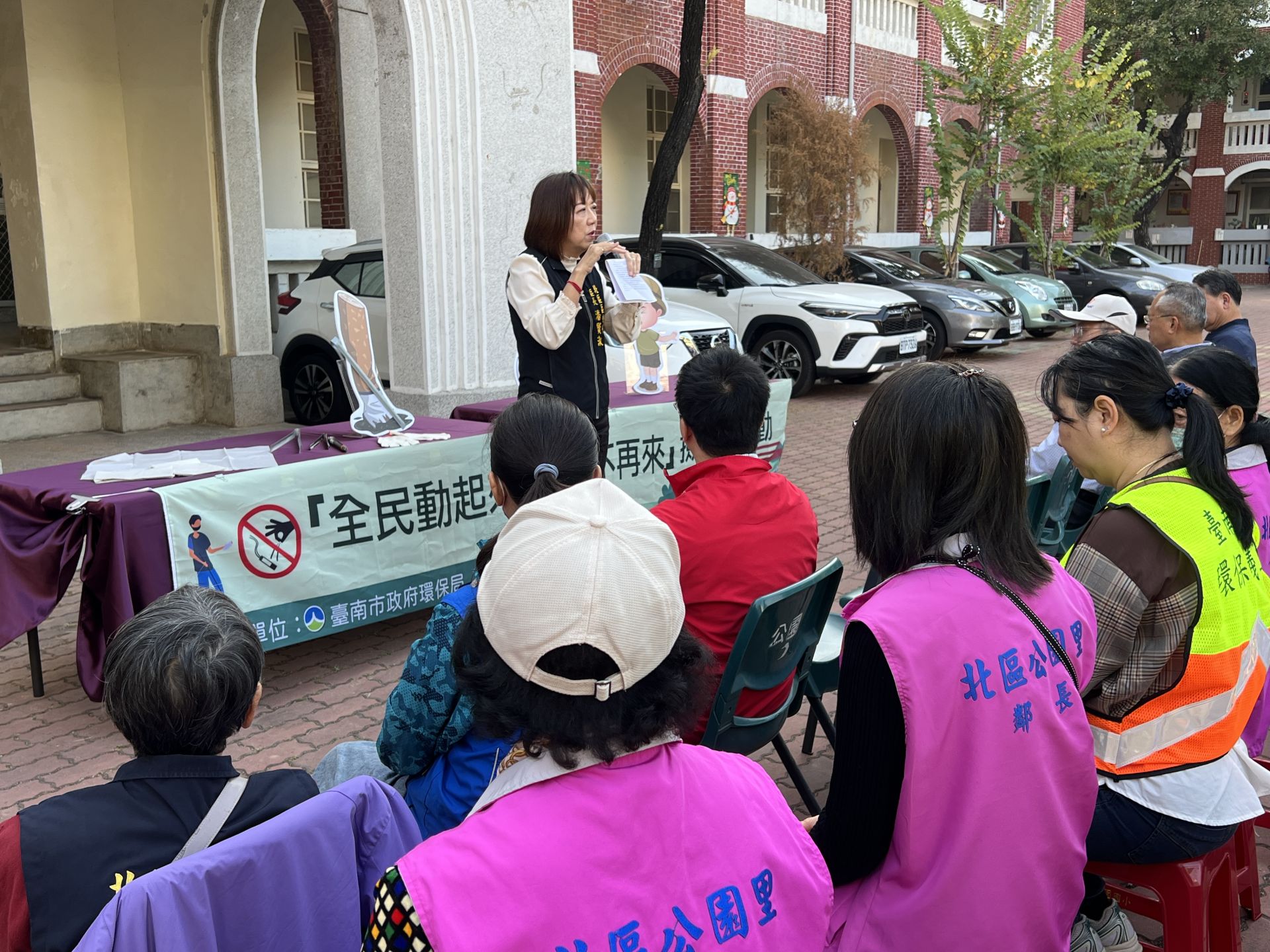 北區區公所今(5)日上午在臺南市北區公園國民小學花園樓川堂,與里長、公園國小師生共同發起「全民動起來,菸蒂不再來」誓師活動,計有102人參加,北區區長潘寶淑、臺南市北區公園國小校長朱英男、北區清潔隊、公園里長徐富美及環保志義工們等,偕同學校師生共同展開菸蒂撿拾行動,同時也為北區各里「撿菸蒂競賽」正式揭開序幕。