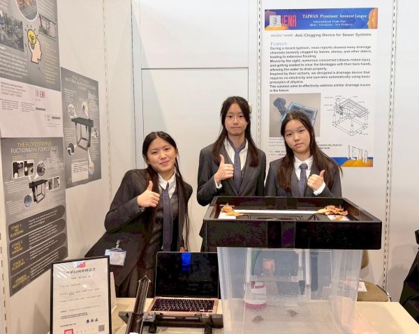 高雄美國學校學生施泱汝、千庾悧、徐睿俞,在曾詠辰與汪清文老師帶領下,則發明「下水道防堵裝置」。其最大特色是「無需電力」,僅以基本物理原理即可自動排水、偵測水位並發出預警,能有效減少居家與公共場域的排水問題,是極具實用性的創新作品,也成功在競賽中脫穎而出。