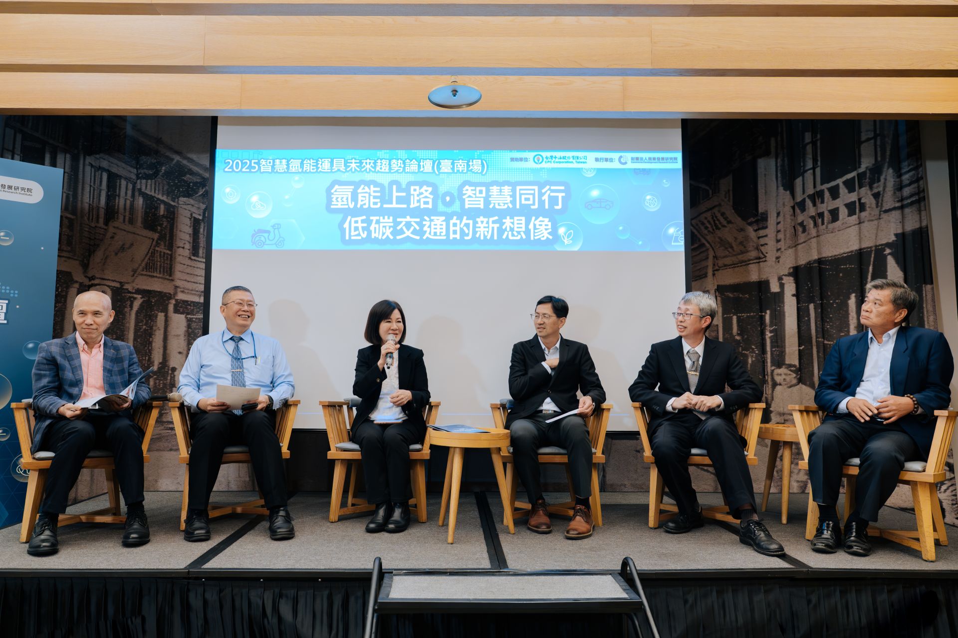 ▲「2025智慧氫能運具未來趨勢論壇」第二場由商研院CDRI副院長張皇珍進行主持。左起高市公車聯管會陳可培主委、成大交管系魏建宏教授、氫谷動能董事長鄭英豪、商業發展研究院副院長張皇珍、中山科學研究院組長李德修、台灣中油公司顏子翔經理 (記者黃雋淮 攝)