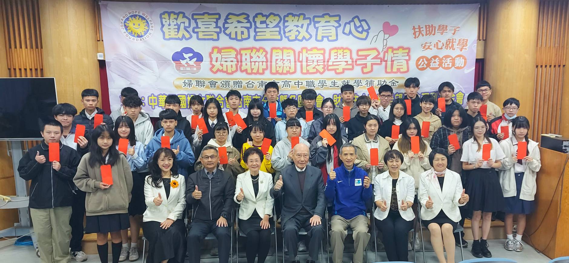 中華民國婦女聯合會與財團法人中華民國婦聯社會福利基金會為協助清寒弱勢家庭的孩子安心努力向學,14日上午假新營高中,頒贈臺南市轄內25校之39位高中職學生就學補助金,每人一萬元。頒贈儀式係由婦聯會臺南市分會與歡喜希望社會福利基金會攜手辦理。歡喜希望社會福利基金會則捐款五萬元給新營高中「教育儲蓄專戶」,共同為扶助弱勢學生,確保安心就學略盡綿薄。