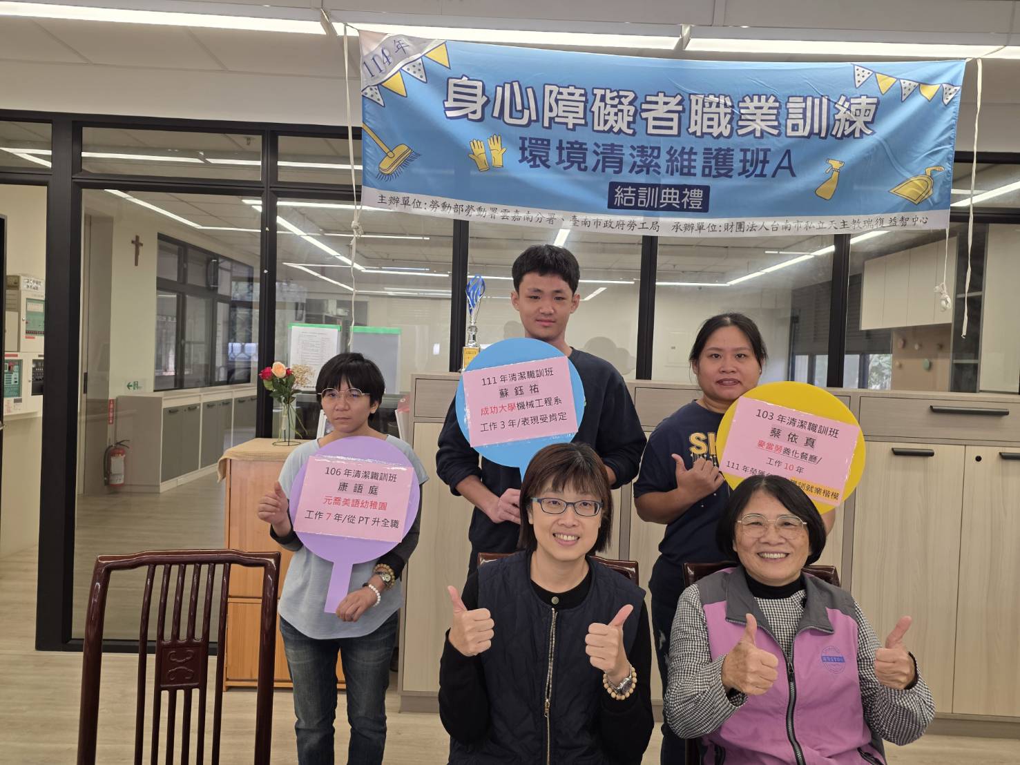 臺南市政府勞工局為慢飛天使打造「希望家園」,落實市長黃偉哲施政願景,於今年委託財團法人台南市私立天主教瑞復益智中心辦理「環境清潔維護班A」,歷經半年790小時密集訓練,10位心智障礙學員已習得清潔一技之長,於今(29)日完訓舉行結訓典禮,準備迎向職場開創更美好的未來。
