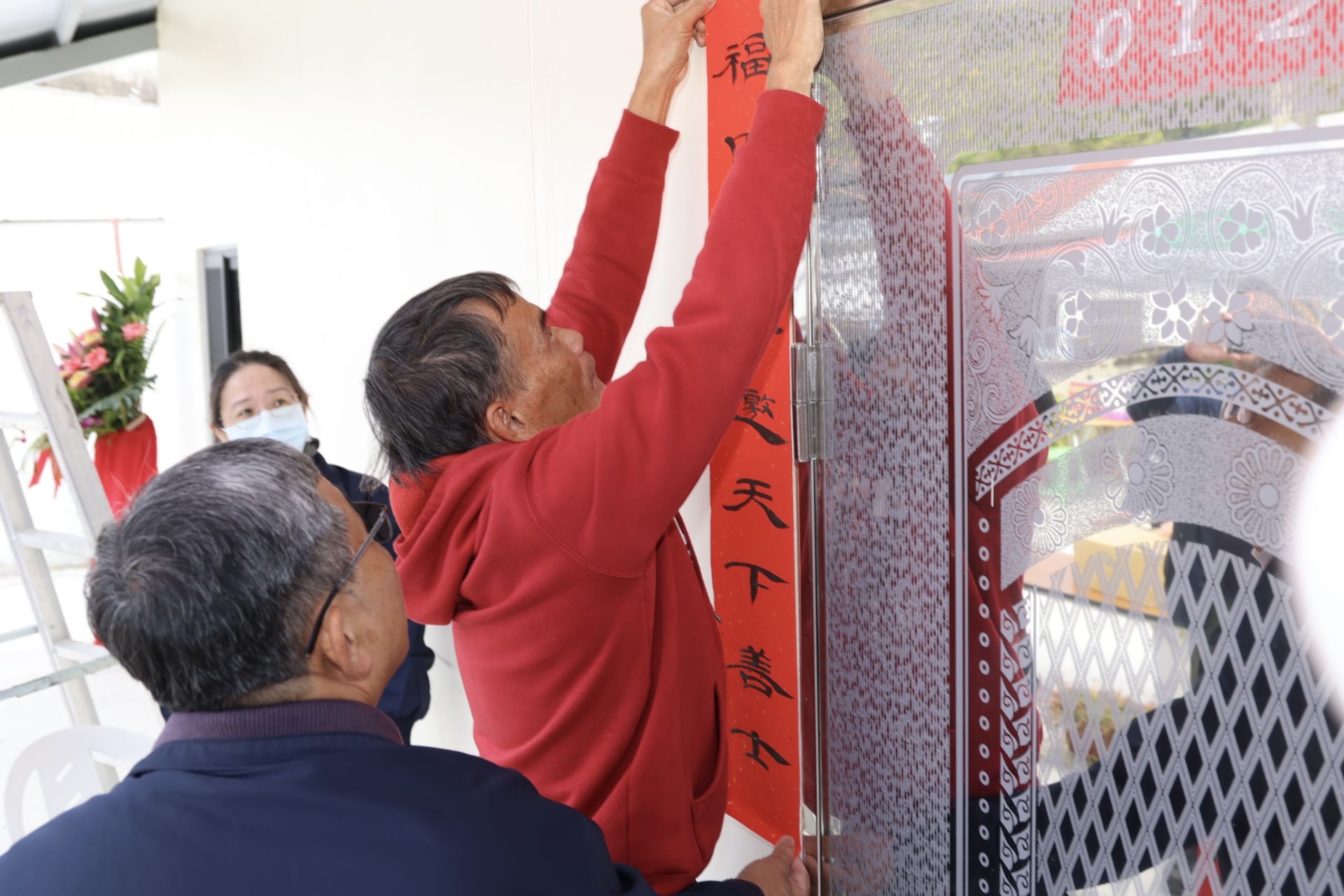 ▲受災戶貼上新春聯,歡喜入住新家。(新聞處 提供)