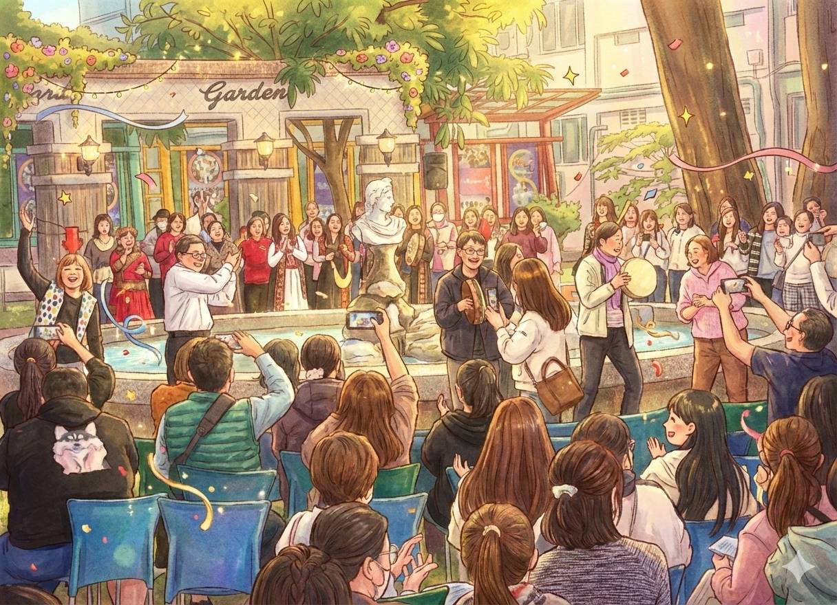 演出尾聲,一名學生裝扮成財神爺驚喜現身,發送象徵好運的「搖錢樹」小禮包,最後高舉「祝大吉大利」條幅,掀起全場高潮,掌聲不斷。這場結合音樂、舞蹈與互動的快閃活動,不僅展現幼保系學生的創意與活力,也讓校園空間化身為充滿驚喜的藝術舞台。