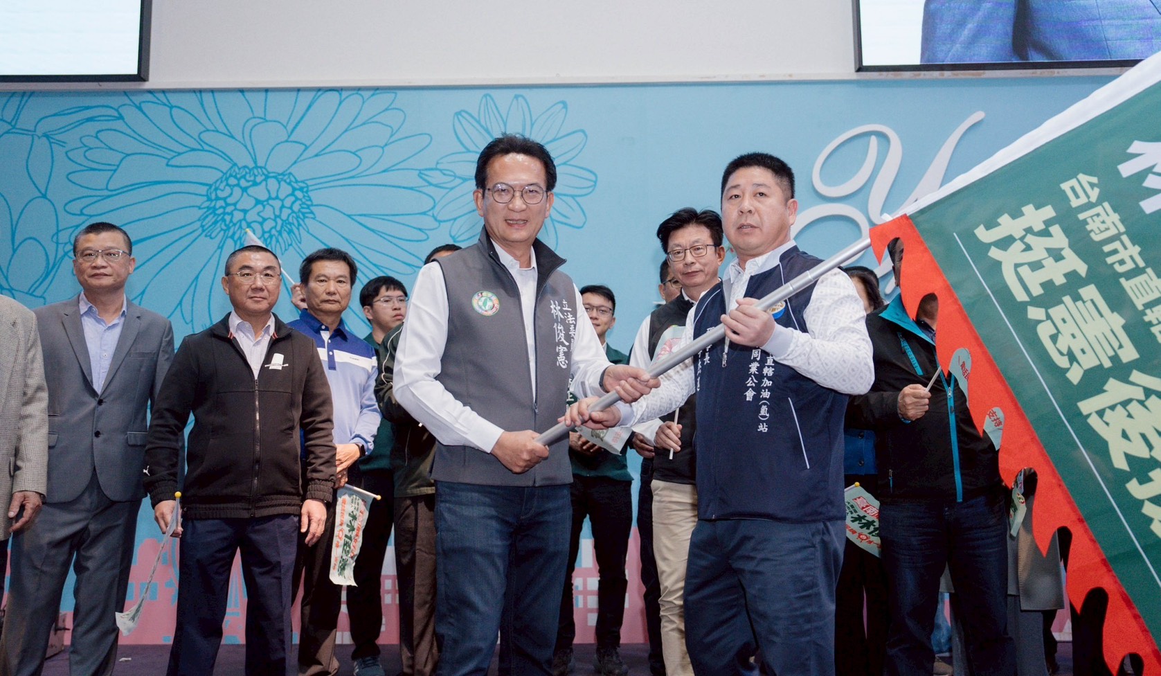 ▲大台南市長參選人林俊憲授旗給台南市直轄加油站公會理事長李杰迅。(立委林俊憲團隊 提供)