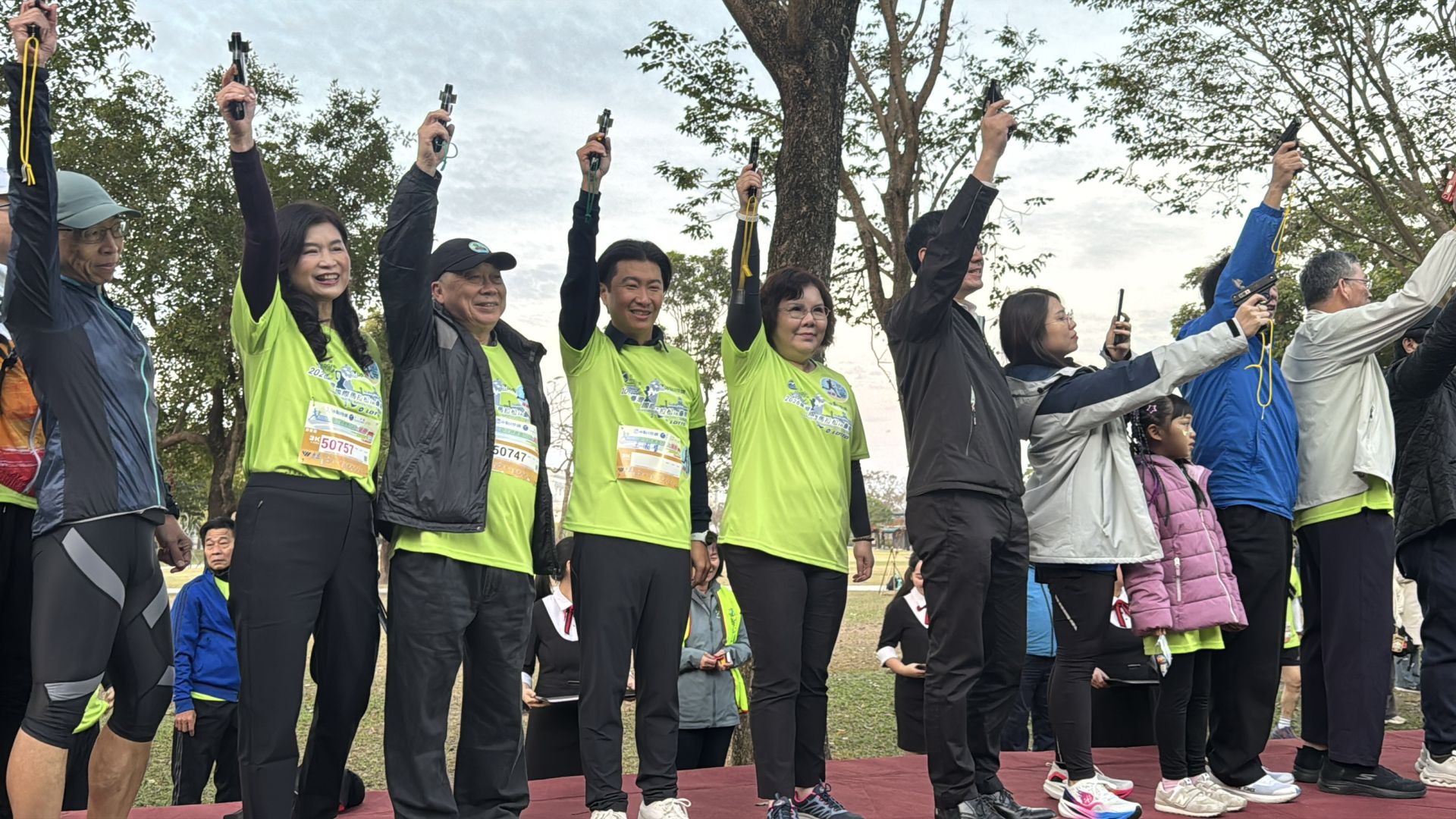 ▲「2026臺灣國際馬拉松in臺南」比賽中華醫大臺南市校友會會長謝馨慧、董事長陳智文、全國校友總會會長王國贊、校長李碧娥(左二至左五)等受邀主持鳴槍。(圖/中華醫大提供)