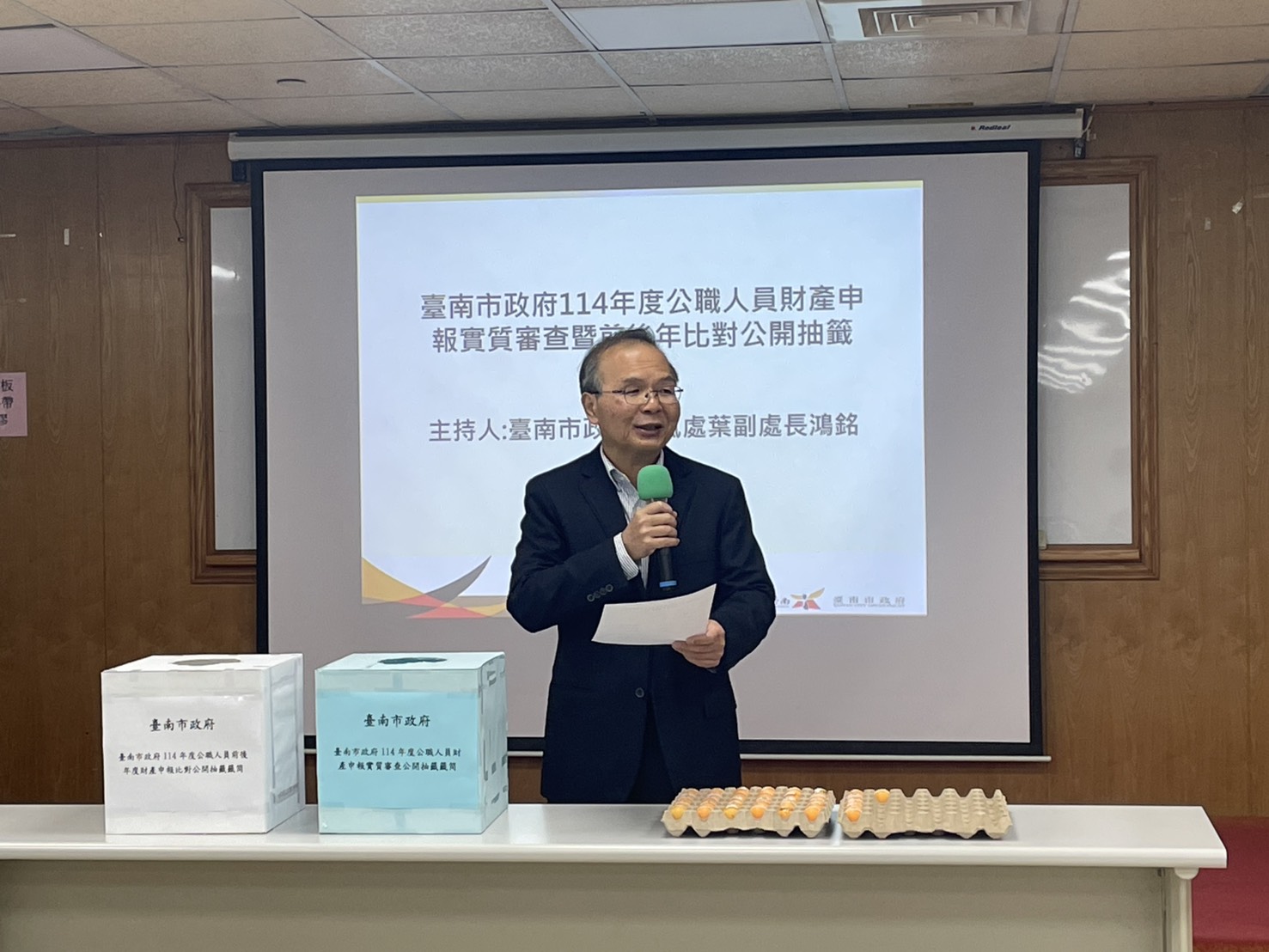 公務員財產申報馬上抽,114年度財產申報實質審查中籤名單正式揭曉囉!臺南市政府於今(12)日上午10時,在永華市政中心11樓訓練教室辦理「114年度公職人員財產申報實質審查暨前後年度財產比對公開抽籤會議」,由市府政風處副處長主持,在各單位共襄盛舉,共同見證下,順利完成抽籤程序,展現廉潔施政與程序透明的決心。