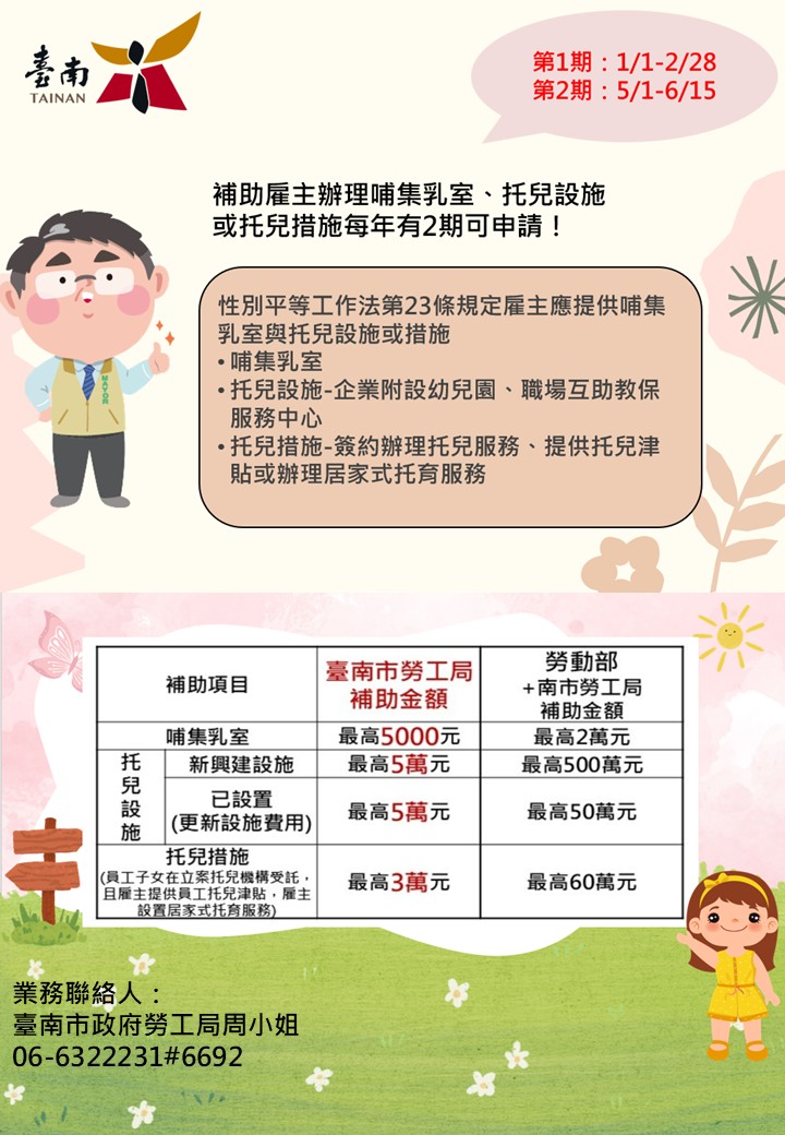 為鼓勵事業單位營造友善職場育兒環境,協助勞工兼顧工作與家庭照顧責任,達到育才與留才之效,並持續落實黃偉哲市長「希望家園」的施政理念,臺南市政府勞工局持續推動雇主設置哺(集)乳室及托兒設施,或提供托兒措施,並受理相關經費補助申請,即日起至 2 月 28 日止,歡迎事業單位踴躍提出申請。