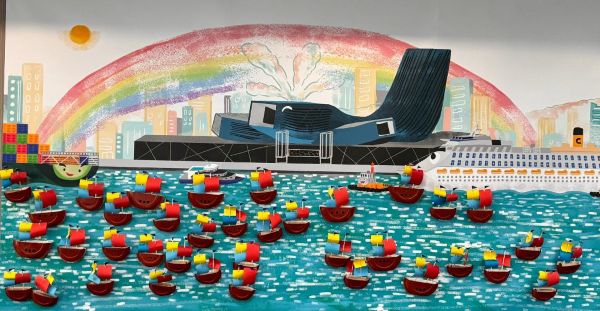 6.王錦榮總經理攜手小朋友張貼傳承小帆船,場面溫馨,傳遞城市記憶與港口文化。