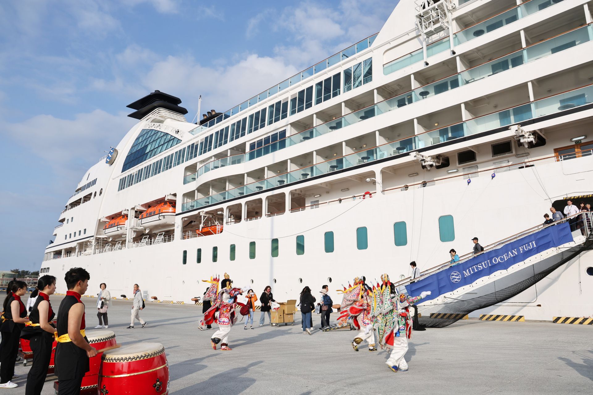 海洋富士號(MITSUI OCEAN FUJI)全長198.2公尺、船寬25.6公尺,總噸位32,477噸、吃水深度6.4公尺,為日本百年海運企業三井海洋郵輪集團(MITSUI OCEAN CRUISES)於2023年創立的高端郵輪品牌。該航段自日本那霸出發,依序停靠高雄港、安平港、基隆港後返回那霸,提供旅客結合四季風情與日式款待的精緻旅遊體驗,也讓國際旅客得以悠閒深度探索台灣。