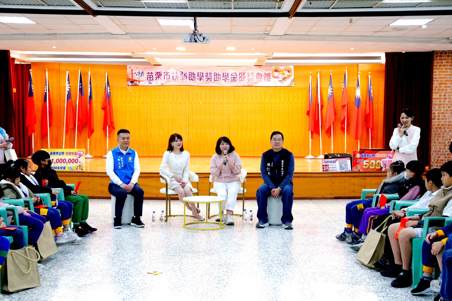 114學年度第一學期的「苗栗市扶弱助學獎助學金頒獎典禮」今(24)日在苗栗市公所三樓藝文中心舉辦。本次共有101名優秀學生獲獎,每人獲頒5000元獎助學金。余市長每年捐出了50萬元薪資,再加上各界善心人士的踴躍捐款,每學期嘉惠了本市100位高中職以下的學子,每人獲得5000元獎助學金,讓孩子們能安心就學、努力追夢。
