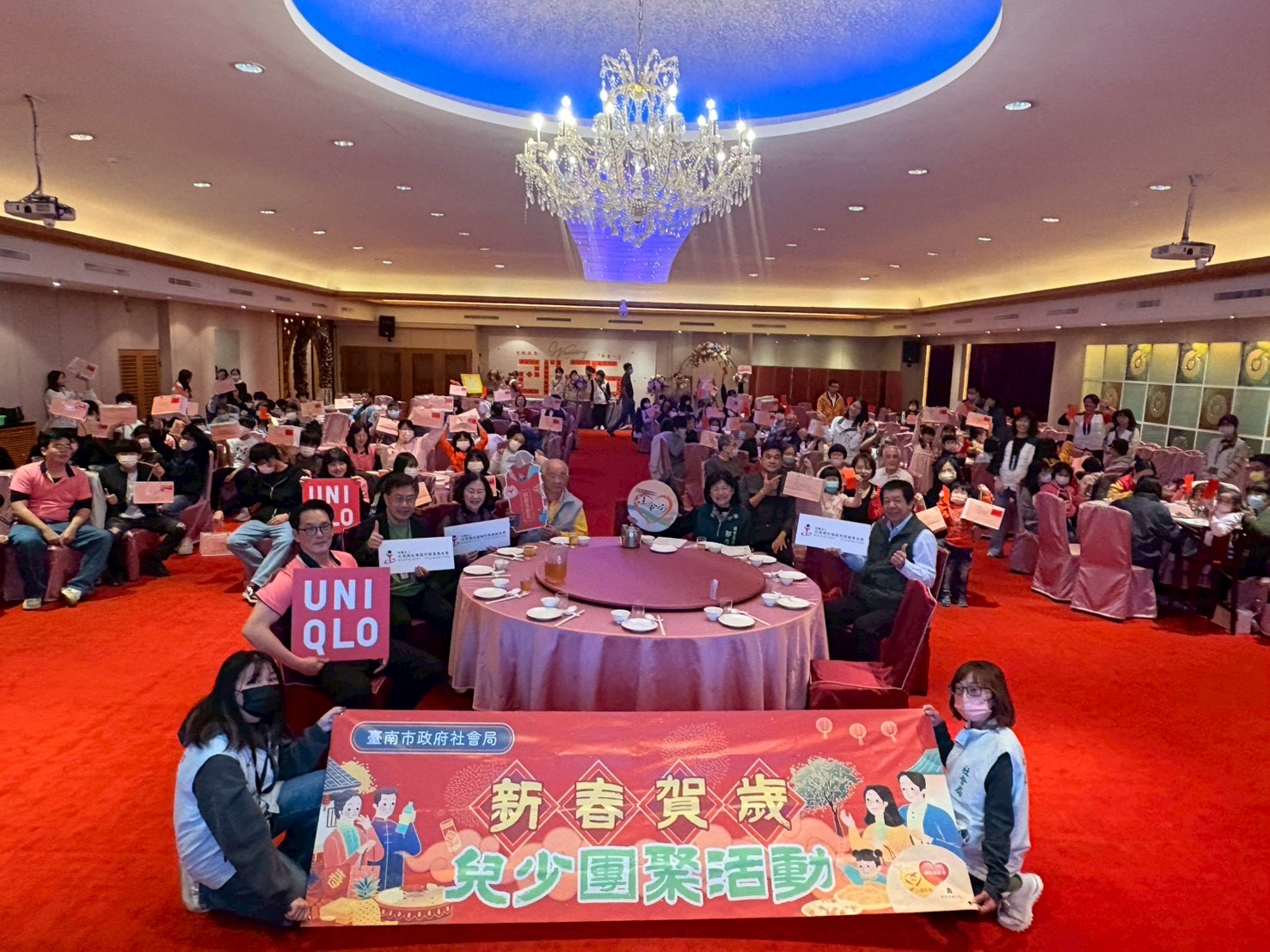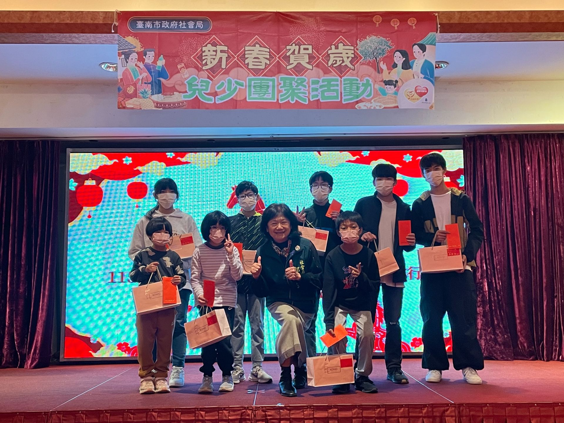 黃曆春節將至,為陪伴南市監護兒少在歲末寒冬中感受關懷與溫暖,臺南市政府社會局今(24)日假總理大餐廳辦理「馬年開基幸福到 福(服)氣連連伴你行」春節活動,邀請監護兒少提前團圓圍爐迎新年。副市長姜淋煌在社會局長郭乃文陪同下,代表市長黃偉哲到場致意並致贈春節紅包與祝福禮品,感謝開基玉皇宮長期關懷弱勢、財團法人永長興社會福利慈善基金會與UNIQLO等民間資源長期支持,共同為孩子們送上新年的溫暖祝福。