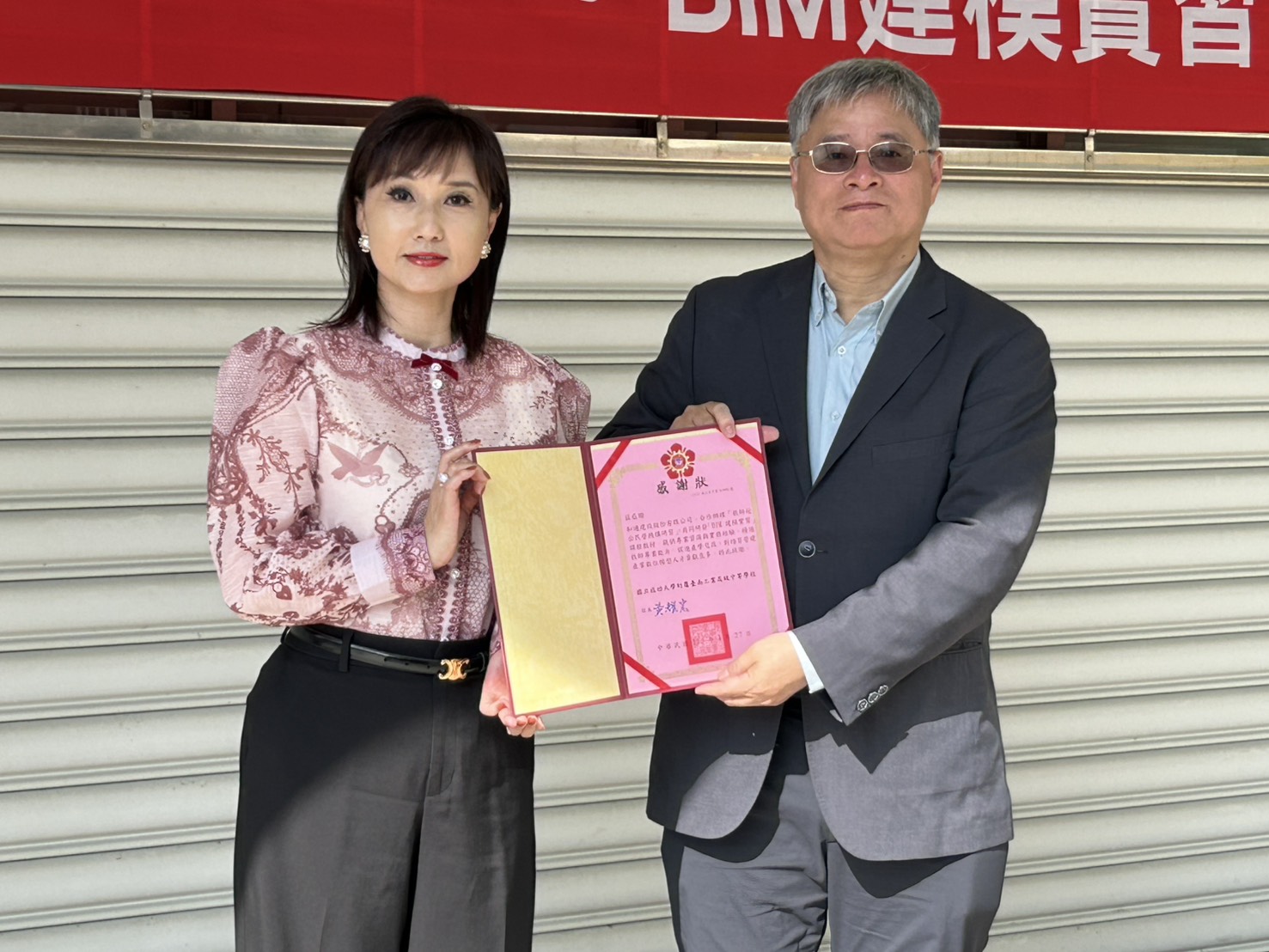 ▲國立成功大學副校長李永春致贈感謝狀給和通建設公司董事長李怡寧。(記者黃雋淮 攝)