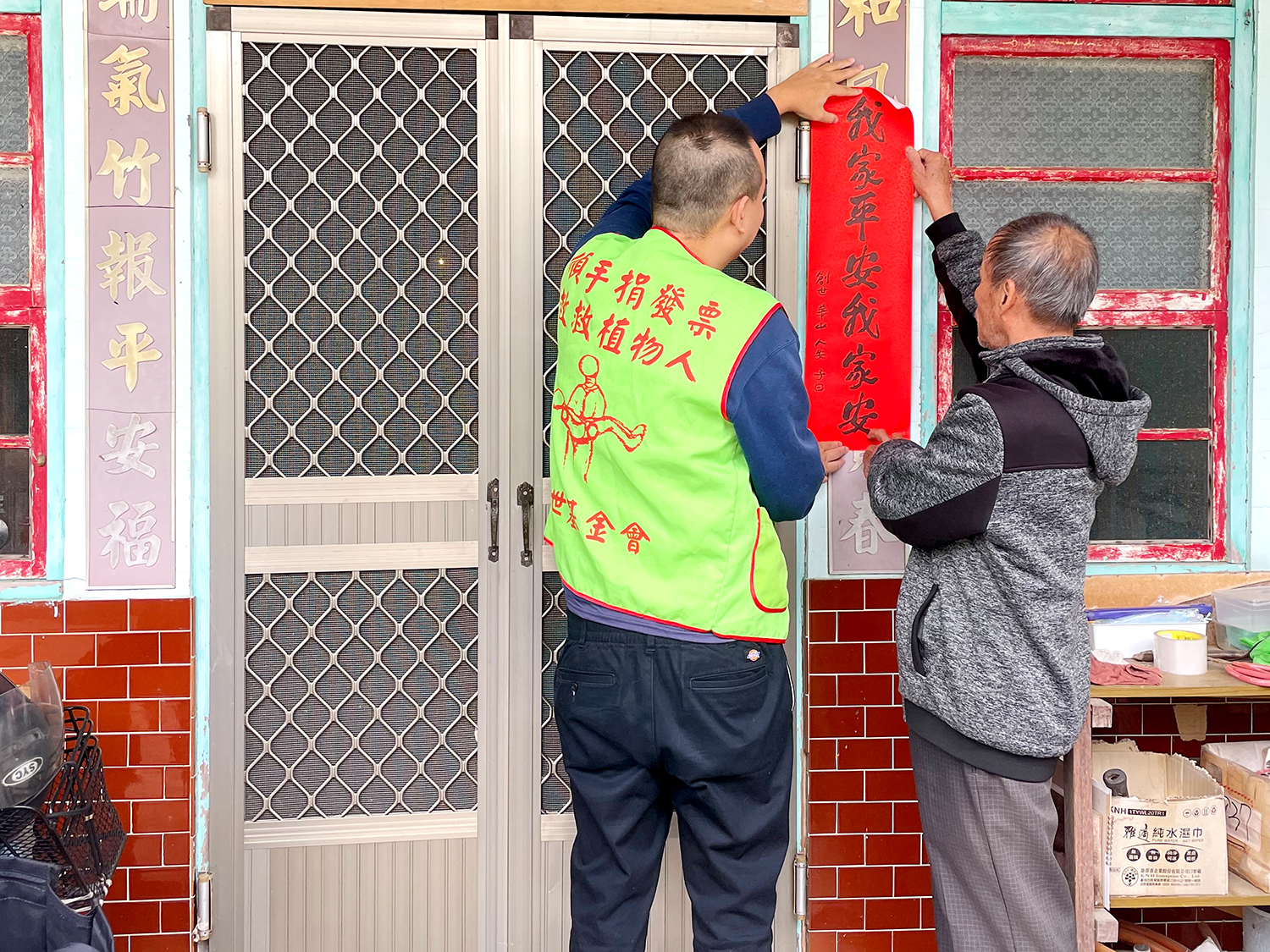 ▲創世志工幫忙貼春聯準備過年。(創世 提供)